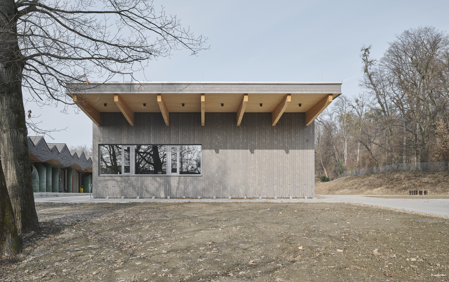 Der Baukörper liegt im Bereich des Universitäts-Sportinstituts der UNI Graz. Er schließt an der Nordostseite an die Halle des Universitätssportzentrums, getrennt durch eine offene Erschließungszone. Die bestehende Wegeführung auf dem Grundstück bleibt erhalten, das Gelände wird nur leicht modelliert, um eine barrierefreie Erschließung - auch der Bestandstribünenzugänge - zu ermöglichen. In den eingeschossigen Körper wird die Technikzentrale über den Nebenräumen um ein Halbgeschoß eingeschnitten.