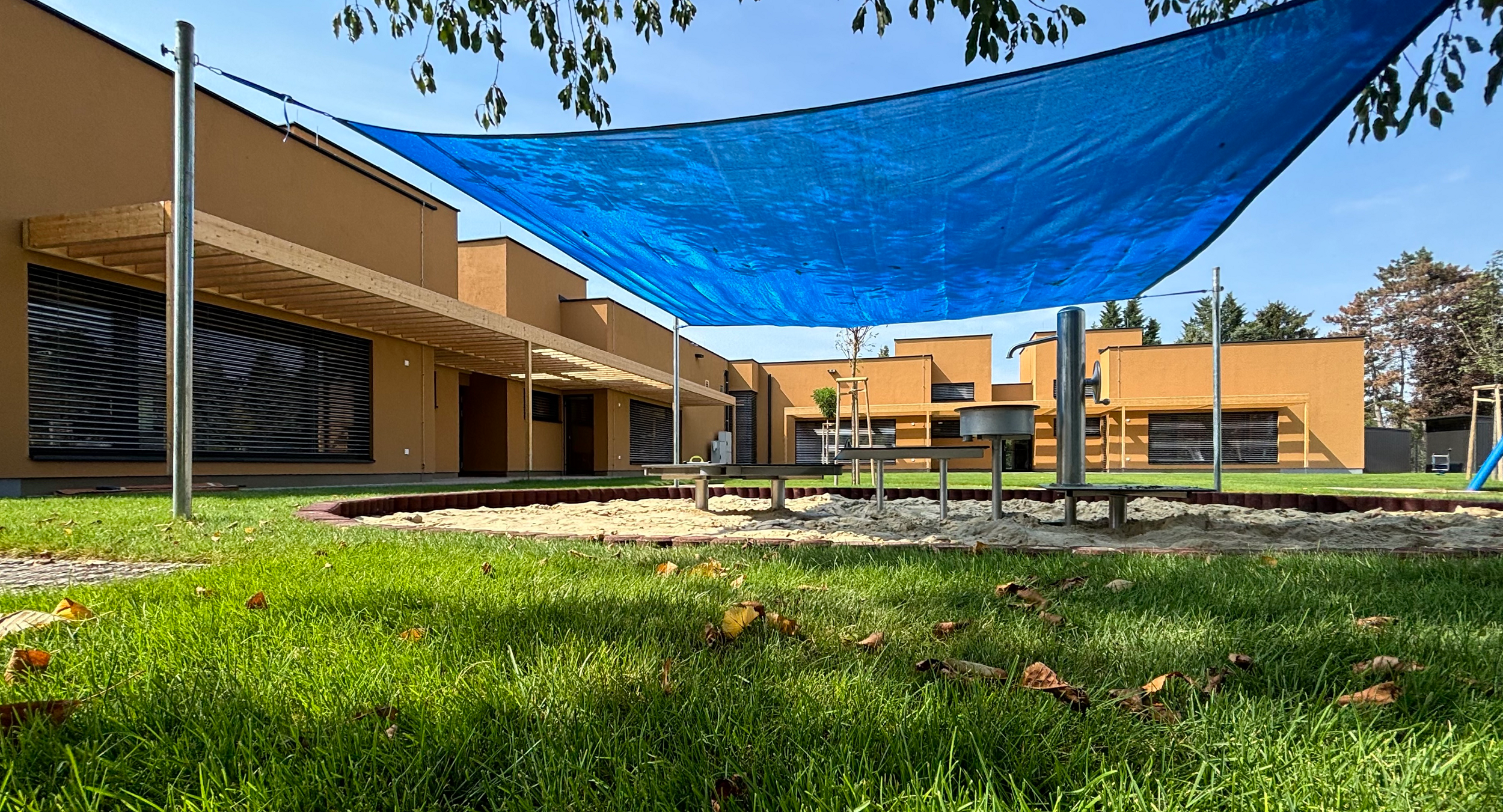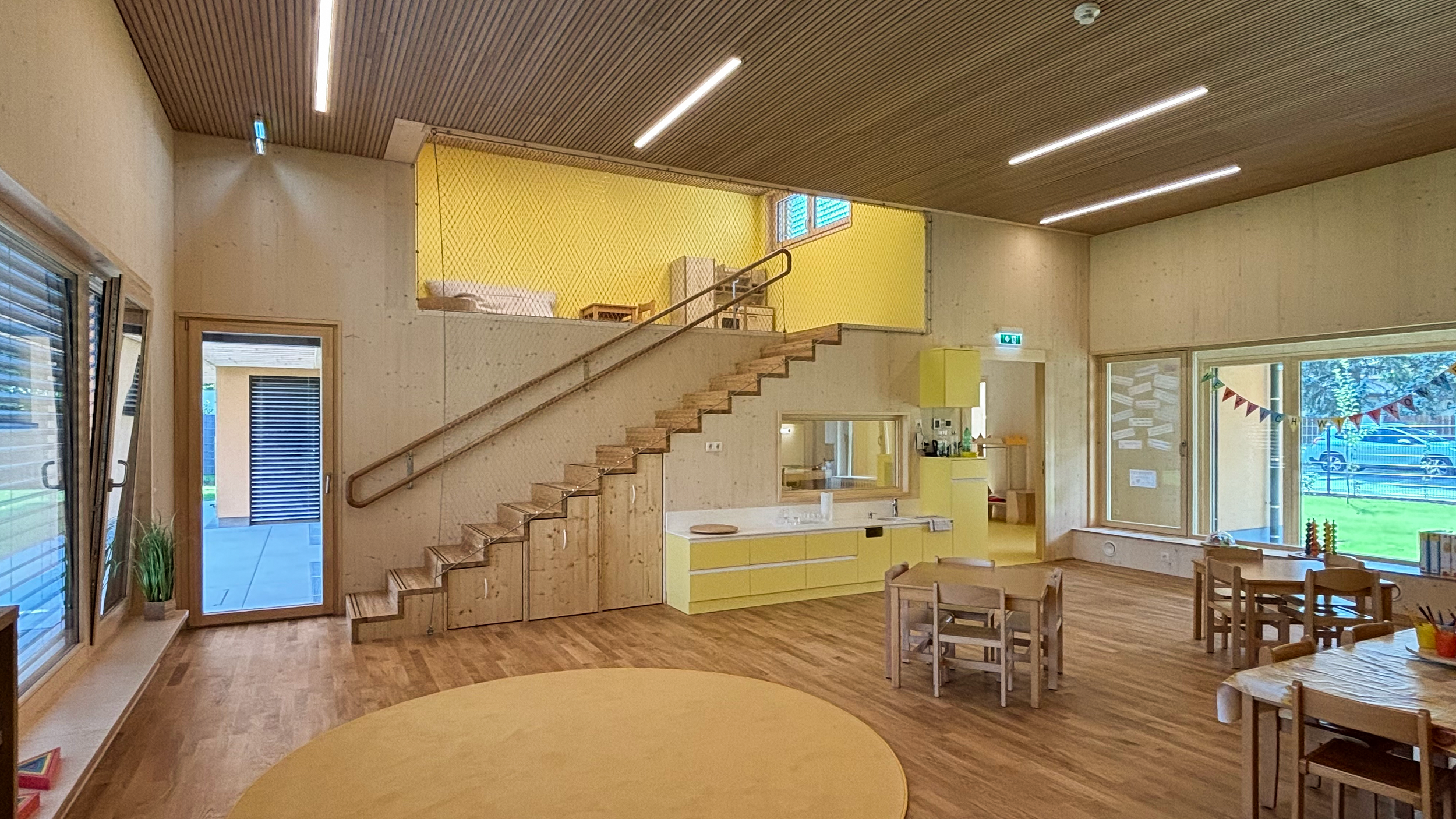 Der Kindergarten ist für vier Gruppen konzipiert und befindet sich auf einem ebenerdigen Grundstück. Die Erschließung erfolgt über einen zentral gelegenen Vorplatz, der durch einen Baum mit Sitzbank gestaltet ist. Das Gebäude wird in Massivholzbauweise errichtet, wobei die erdberührte Bodenplatte aus Beton besteht. Die Fassade ist mit einer Putzoberfläche über einer Holzfaserdämmung versehen. Der Baukörper ist sowohl in der Höhe als auch in der Tiefe gestaffelt. Trotz eines geringen Flächenverbrauchs bietet das Gebäude eine großzügige Raumwirkung. Für eine nachhaltige Energieversorgung sorgen eine Photovoltaikanlage, eine Tiefenbohrung mit Wärmepumpe sowie eine mechanische Lüftungsanlage.