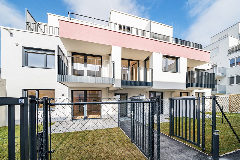 Die Wohnhausanlage besteht aus zwei Baukörpern. Zwischen den Gebäuden befinden sich Eigengärten der Mieter:innen, ein Kinderspielplatz und allgemeine Grünflächen.