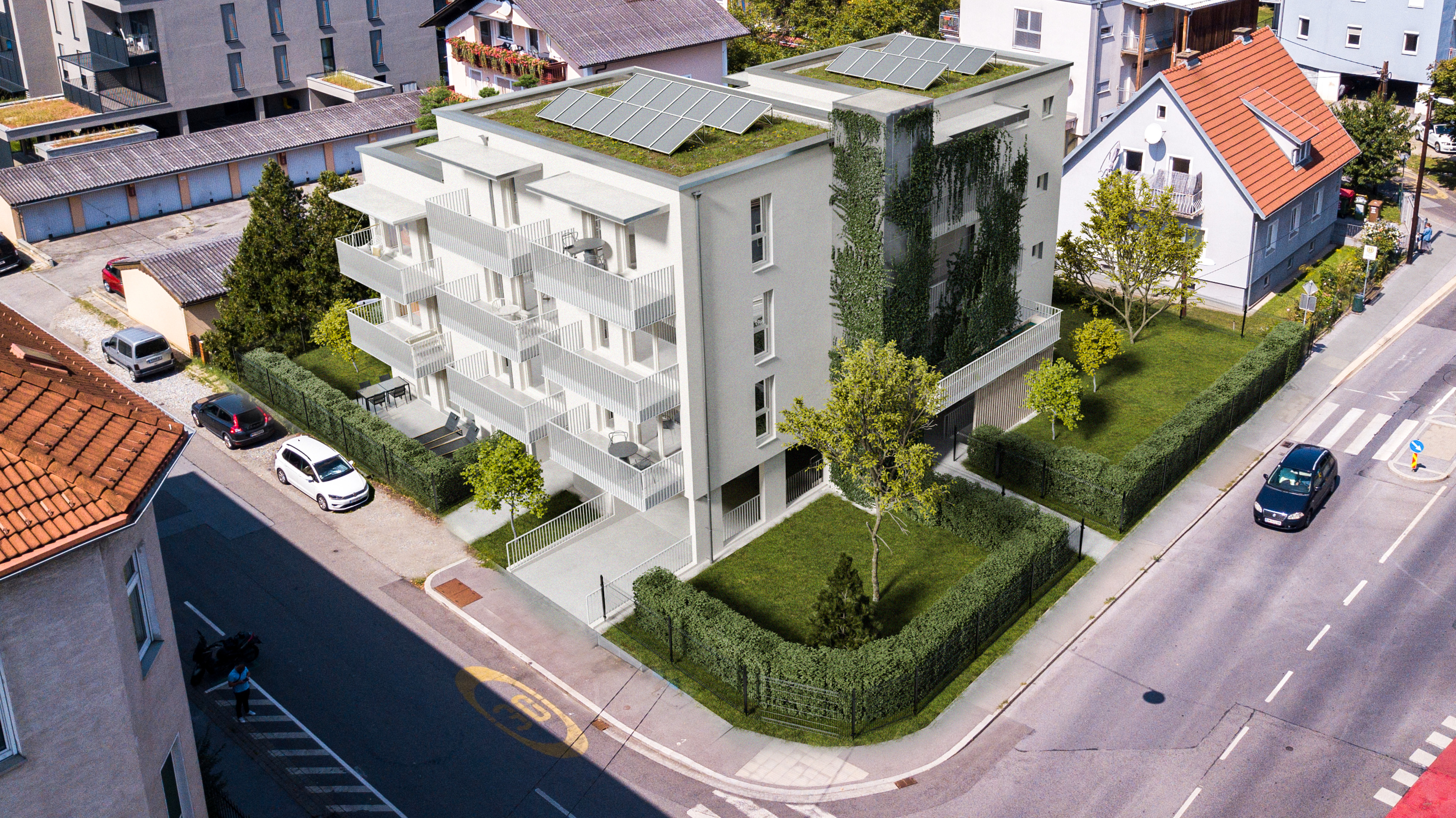 Assanierung im Rahmen der steiermärkischen Wohnbauförderung: An Stelle eines kleinen bestehende Einfamilienhauses erfolgt die Errichtung von 12 Wohneinheiten in 2 viergeschossigen Baukörpern, die durch ein offenes Treppenhaus verbunden sind.