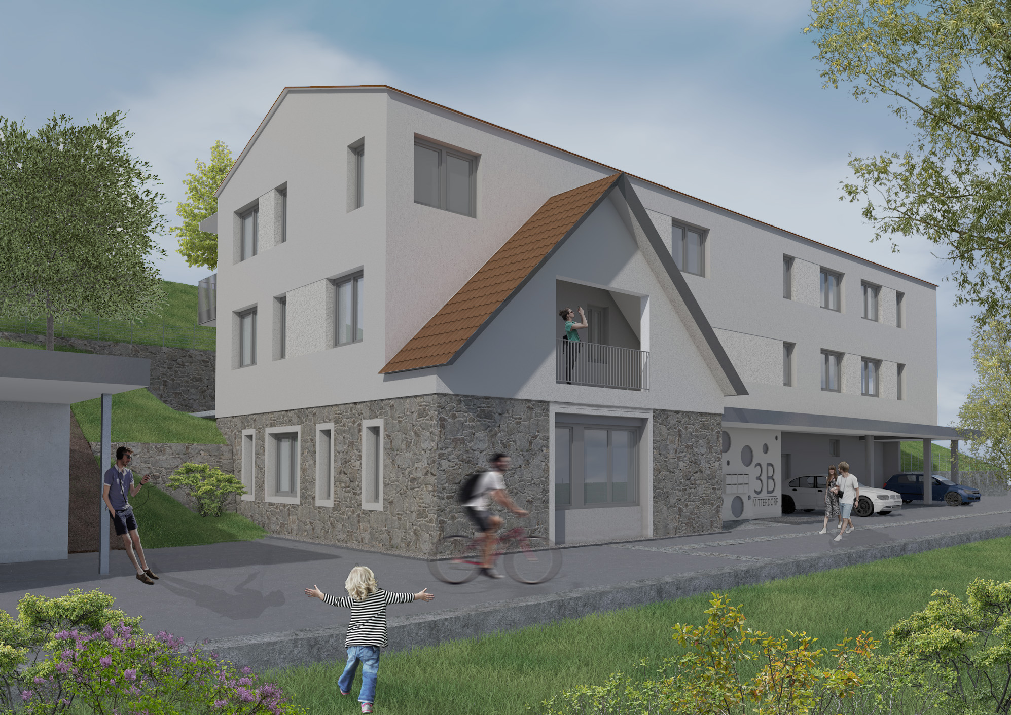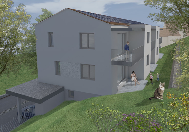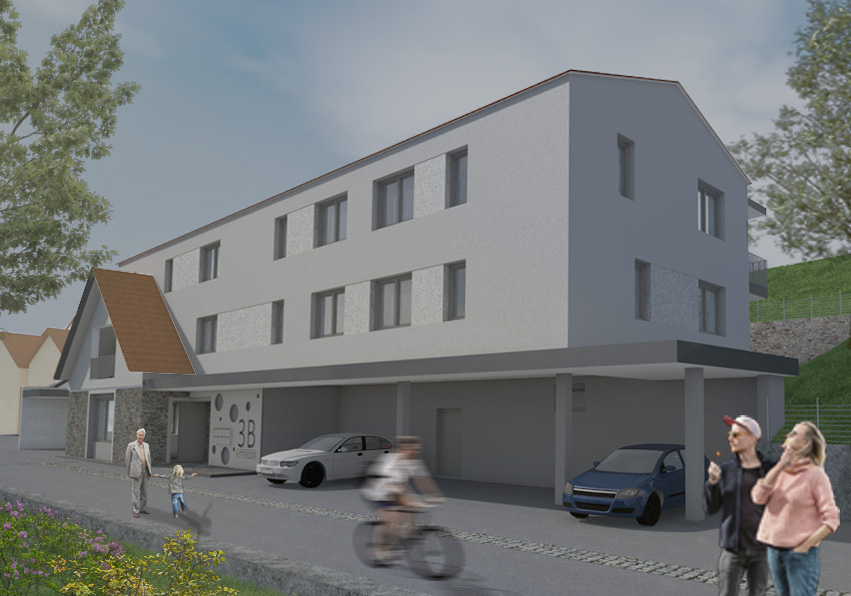 Der 3-geschossige Baukörper positioniert sich entlang der Grundgrenze und orientiert sich am Bestandsgebäude sowie den bestehenden Nachbargebäuden. Das Zentral positionierte Stiegenhaus erschließt über eine Treppe die Wohneinheiten bzw. ermöglicht einen barrierefreien Zugang zu den Therapieräumen. Es besteht die Option einer nachträglichen Errichtung eines Aufzugs im Stiegenhausbereich. Die Wohneinheiten verfügen über Terrassen bzw. Gartenflächen und im obersten Geschoß über Balkone. Die Wohnungsgrößen variieren von einer 2- Zimmer bis zu 4- Zimmer Einheiten und ermöglichen so einen guten Wohngsmix für unterschiedliche Wohnungsbedürfnisse.