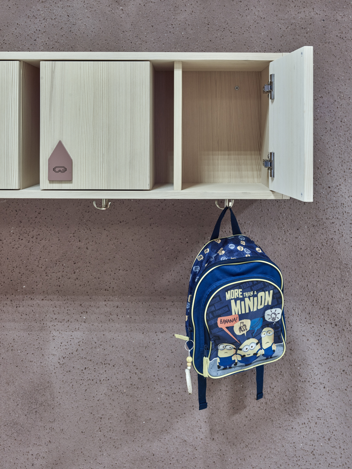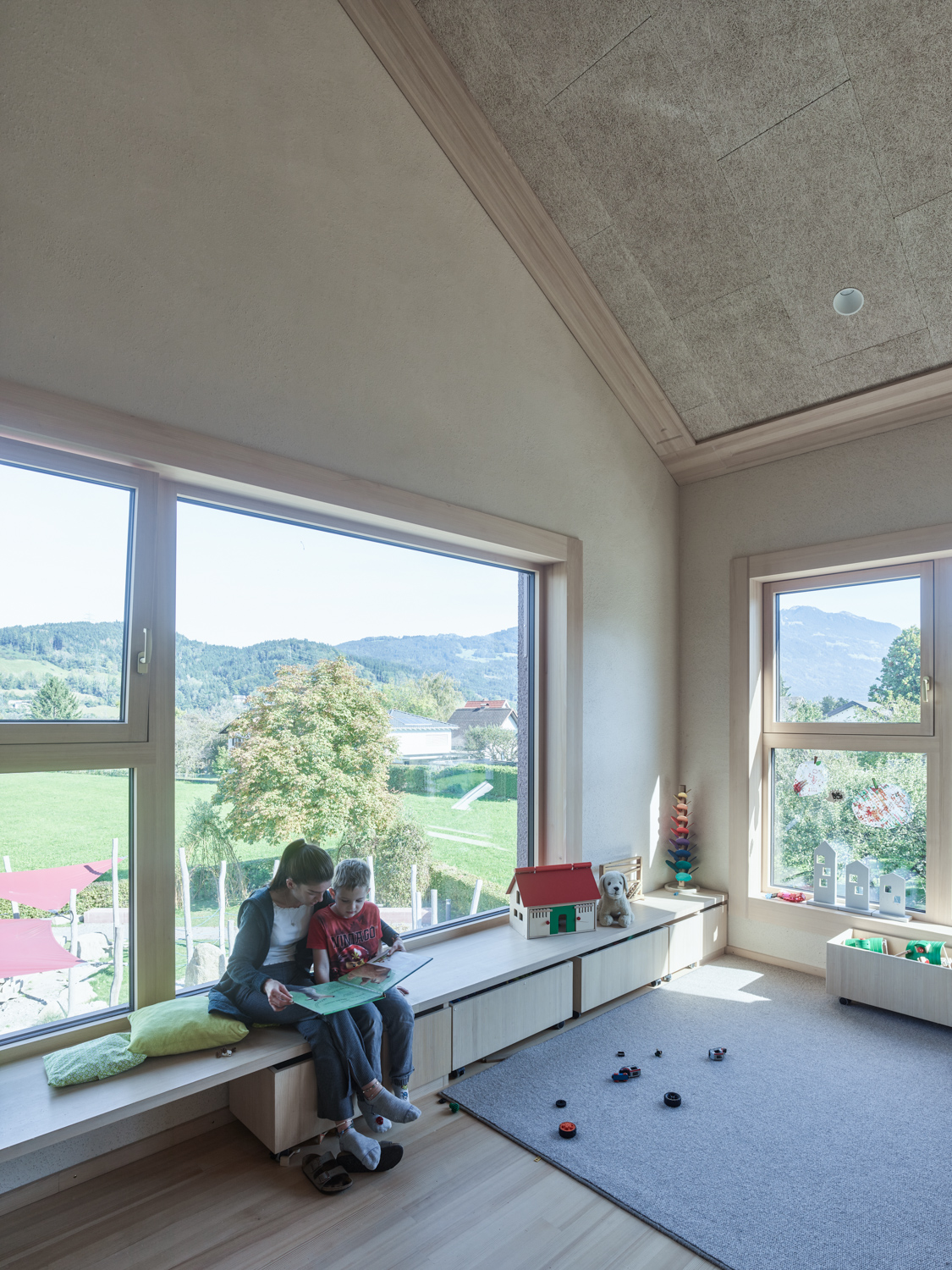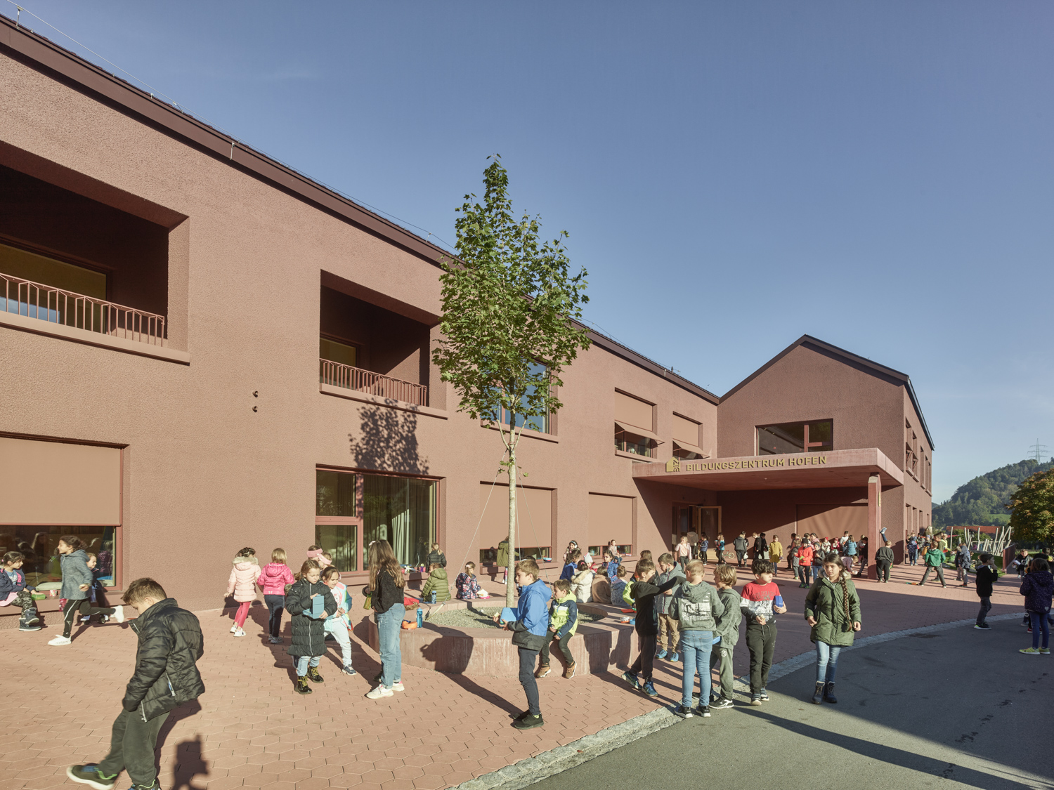 Die bestehende Volksschule in Frastanz in Vorarlberg aus den Fünfzigerjahren wurde erweitert und bietet nun viele Nutzungsmöglichkeiten für alle Dorfbewohner:innen. Alt- und Neubau gehen eine untrennbare Symbiose miteinander ein. Während die äußere Erscheinung in einem homogenen Schokoladeton eingefärbt ist, kommen im Innenraum teils geölte, teils unbehandelte Fichtenböden zum Einsatz. Mit viel Liebe zum Detail wurden Möbel, Raumöffnungen und Wegleitsystem gestaltet, wobei die charakteristische Giebelform des Hauses immer wieder als grafische Vorlage dient. Bei den Baustoffen wurden vor allem regionale Produkte wie etwa Kalkputz eingesetzt, hinzu kommt ein umfassendes Produkt- und Chemikalienmanagement. Zur technischen Versorgung zählen eine Fußbodenheizung sowie eine Lüftungsanlage mit Wärmerückgewinnung.