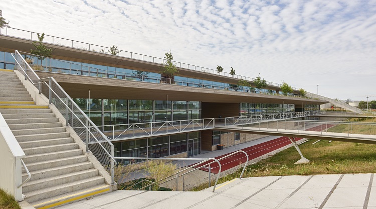 Von der Vorstellung der grünen Stadt ausgehend wird das Schulgebäude als terrassierte Grünlandschaft konzipiert. Es entsteht der begehbare Bildungshügel. Der kompakte Baukörper wird in der Tiefe durch Dachsheds mit blendfreiem Tageslicht versorgt. Durch Balkone und außenliegendem Sonnenschutz wird auch an den Fassaden Blendung verhindert und Überhitzung reduziert. Weiters ist zu seiner Belichtung im Zentrum ein Freiraum eingeschnitten: das Schulwäldchen. Dort, wo es durch Schatten im Sommer kühler ist, erfolgt auch die Luftansaugung. Eine Brunnenanlage dient der Gebäudekühlung und der Gartenbewässerung. Das Gebäude ist praktisch wärmebrückenfrei, der geringe Heizenergiebedarf wird über Wärmerückgewinnung und über Fernwärme gedeckt. Wärme und Kälte werden über Zuluft und Bauteilaktivierung eingebracht.
