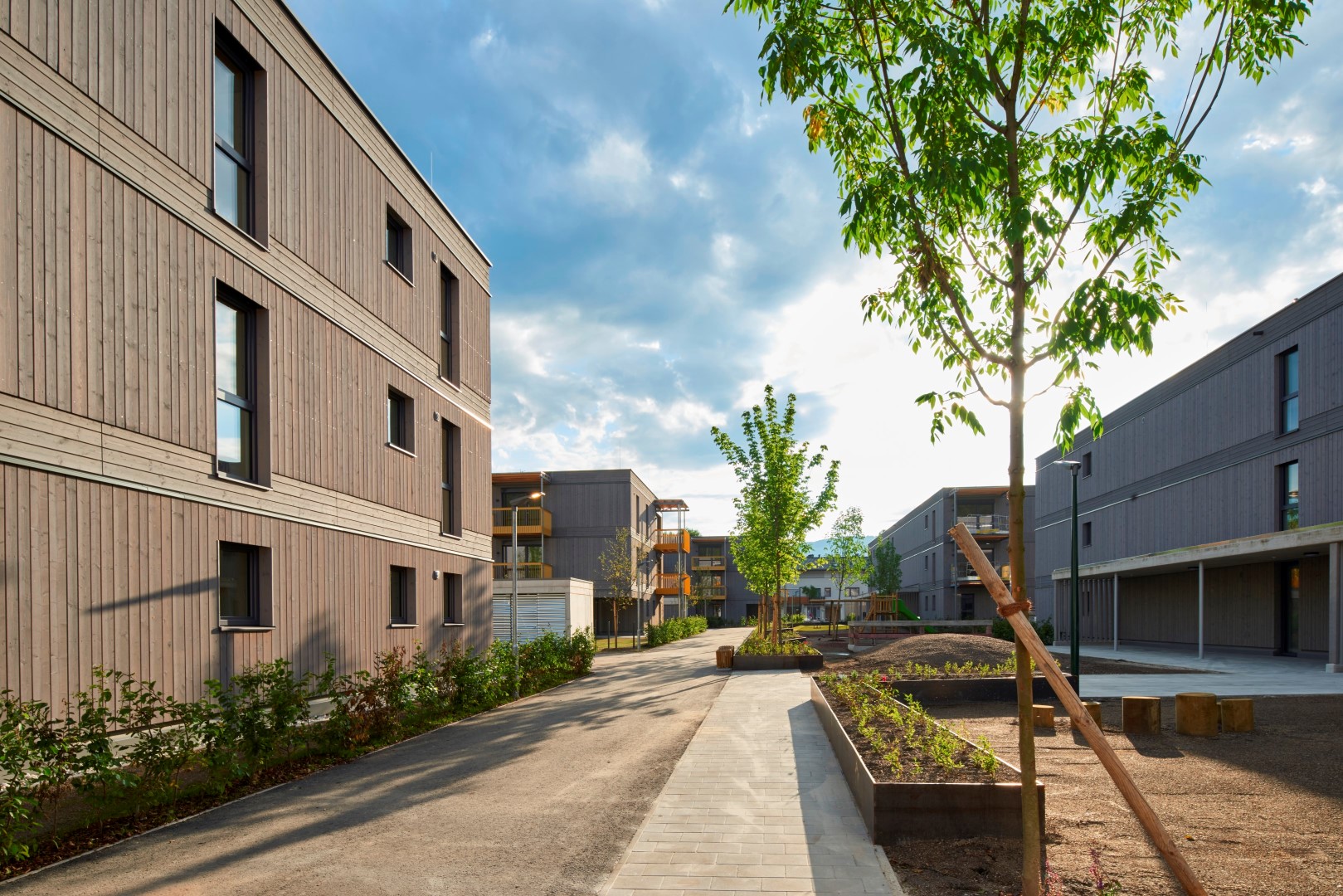 Die Architektur der Gebäude mit jeweils 3 Vollgeschoßen wurde in Holz-Hybridbauweise mit lasierter, offener Holzverschalung geplant (Stiegenhauskern Stahlbeton, Wohnungen Holzbau).