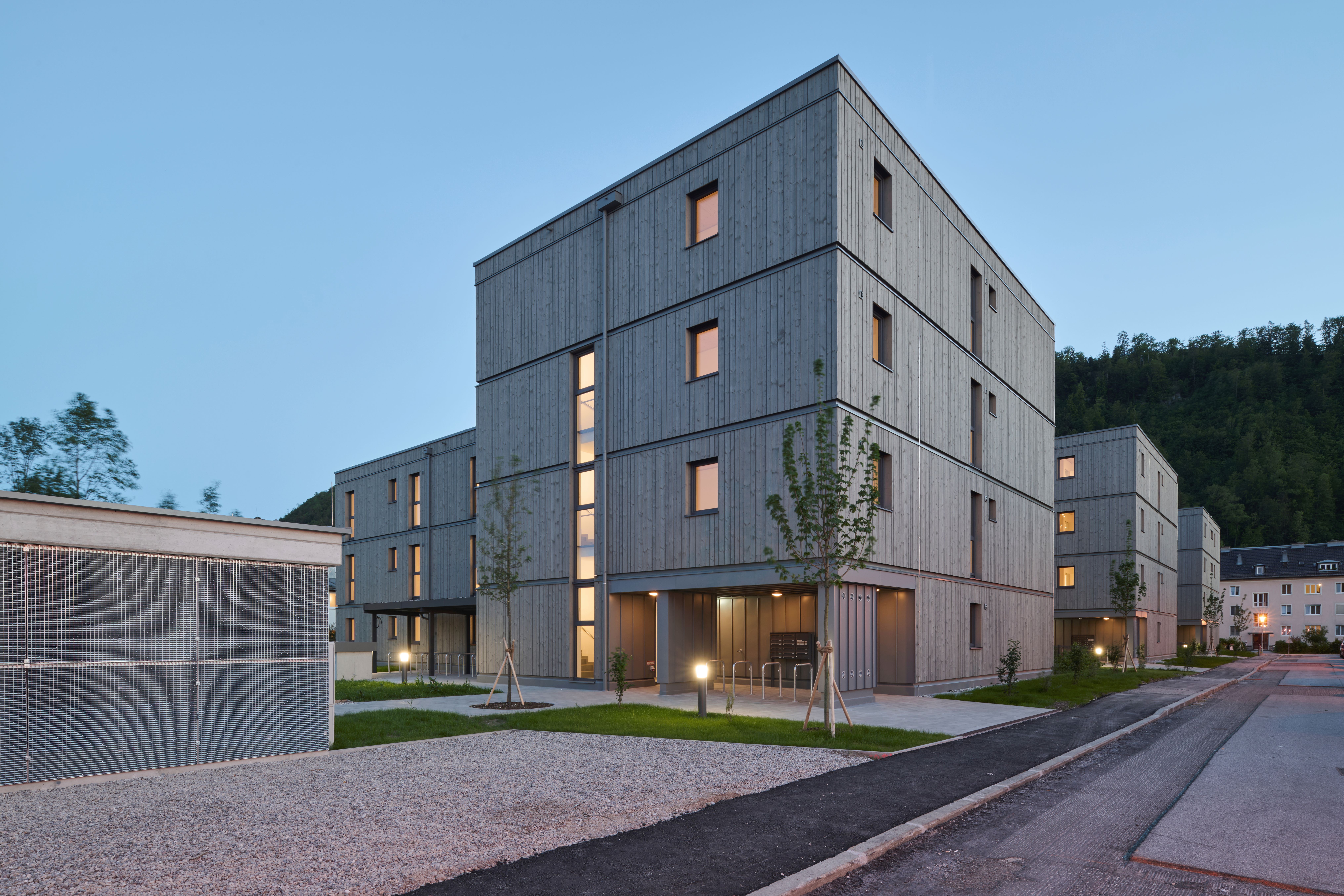 Die Architektur der Gebäude mit jeweils 4 Vollgeschoßen wurde in Holz-Hybridbauweise mit lasierter, offener Holzverschalung geplant (Stiegenhauskern Stahlbeton, Wohnungen Holzbau).
