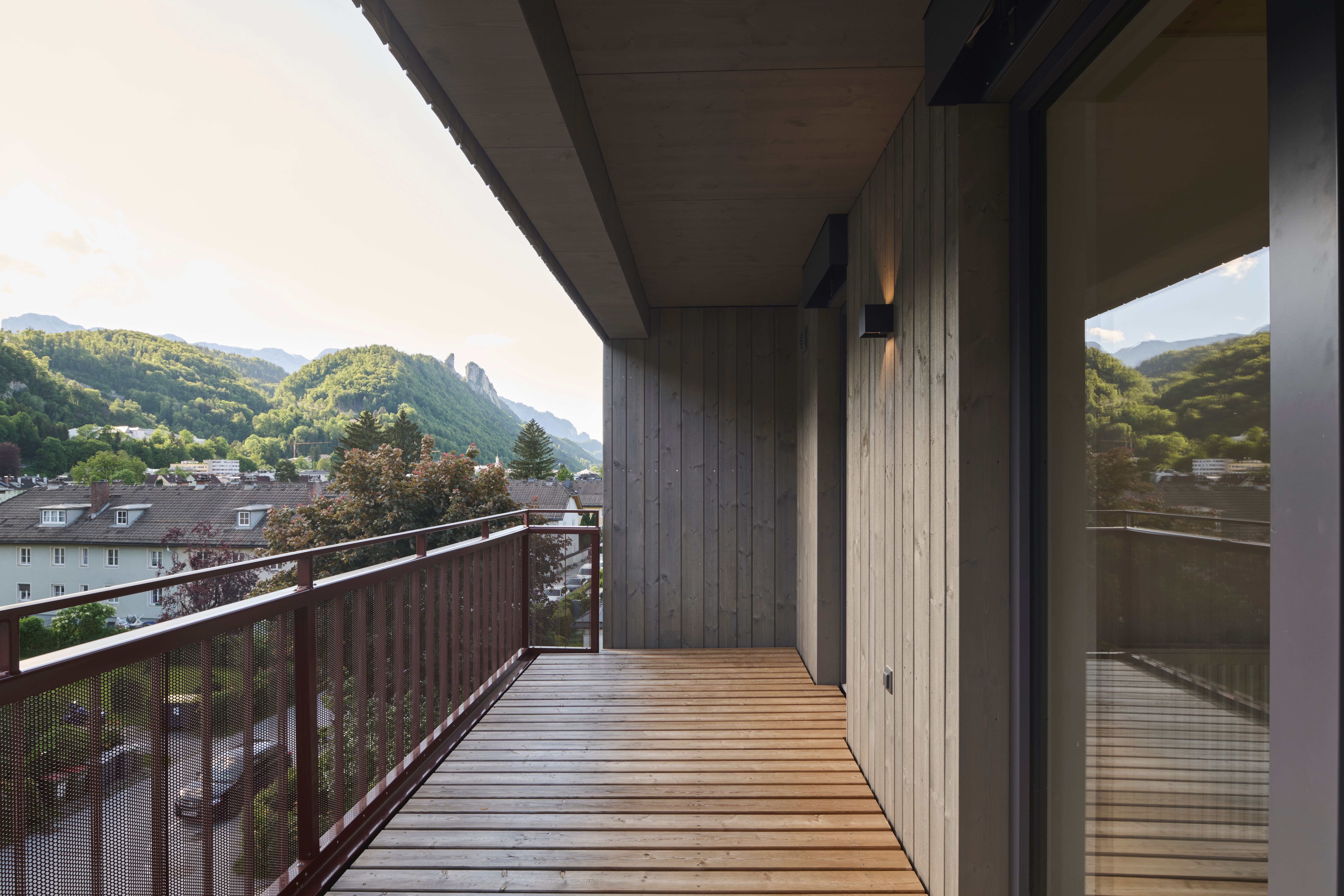 Die Architektur der Gebäude mit jeweils 4 Vollgeschoßen wurde in Holz-Hybridbauweise mit lasierter, offener Holzverschalung geplant (Stiegenhauskern Stahlbeton, Wohnungen Holzbau).