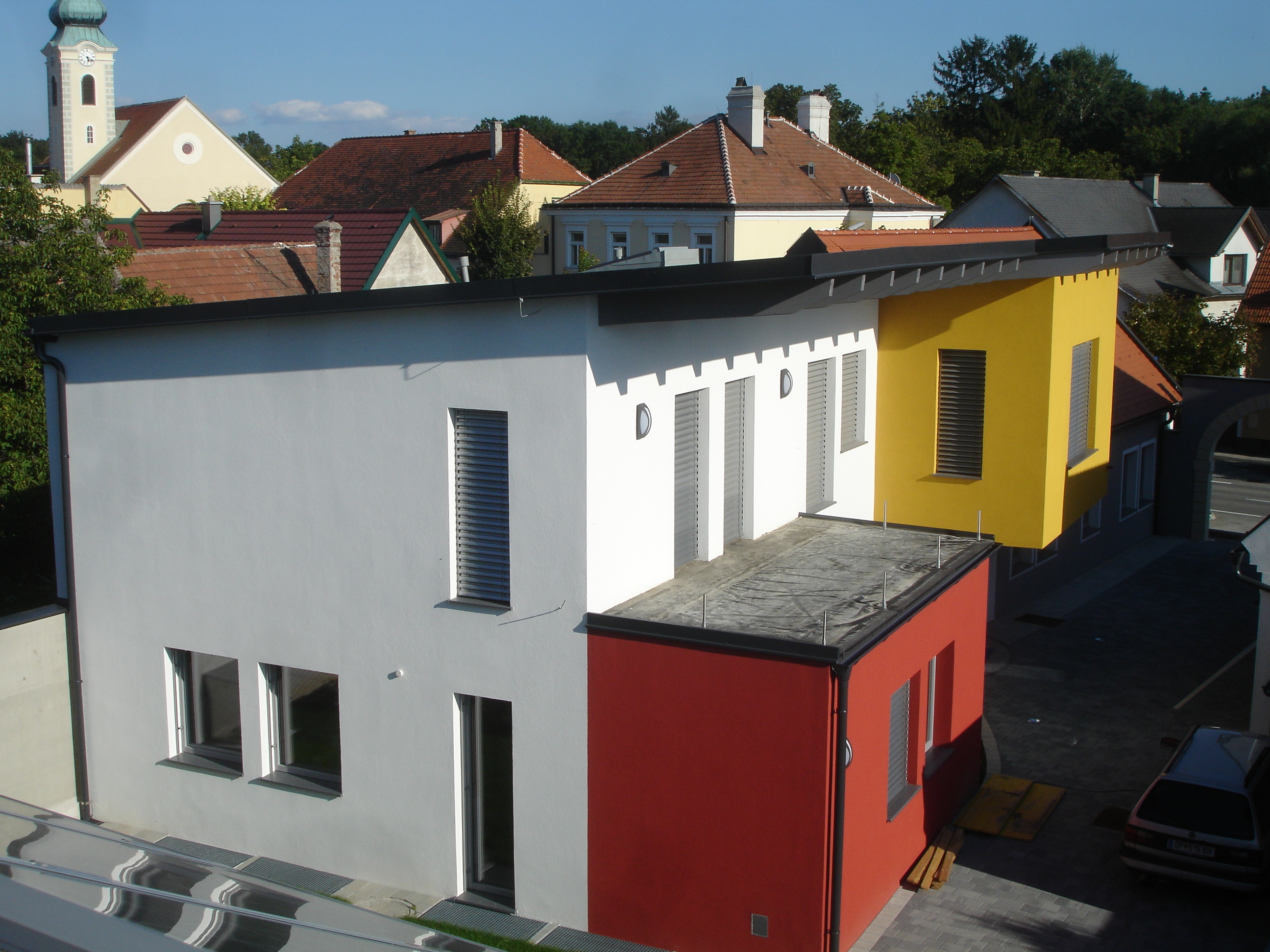Altbestand nachgebaut. Zum Hof hin wurde das Bürogebäude mit einem Pultdach in