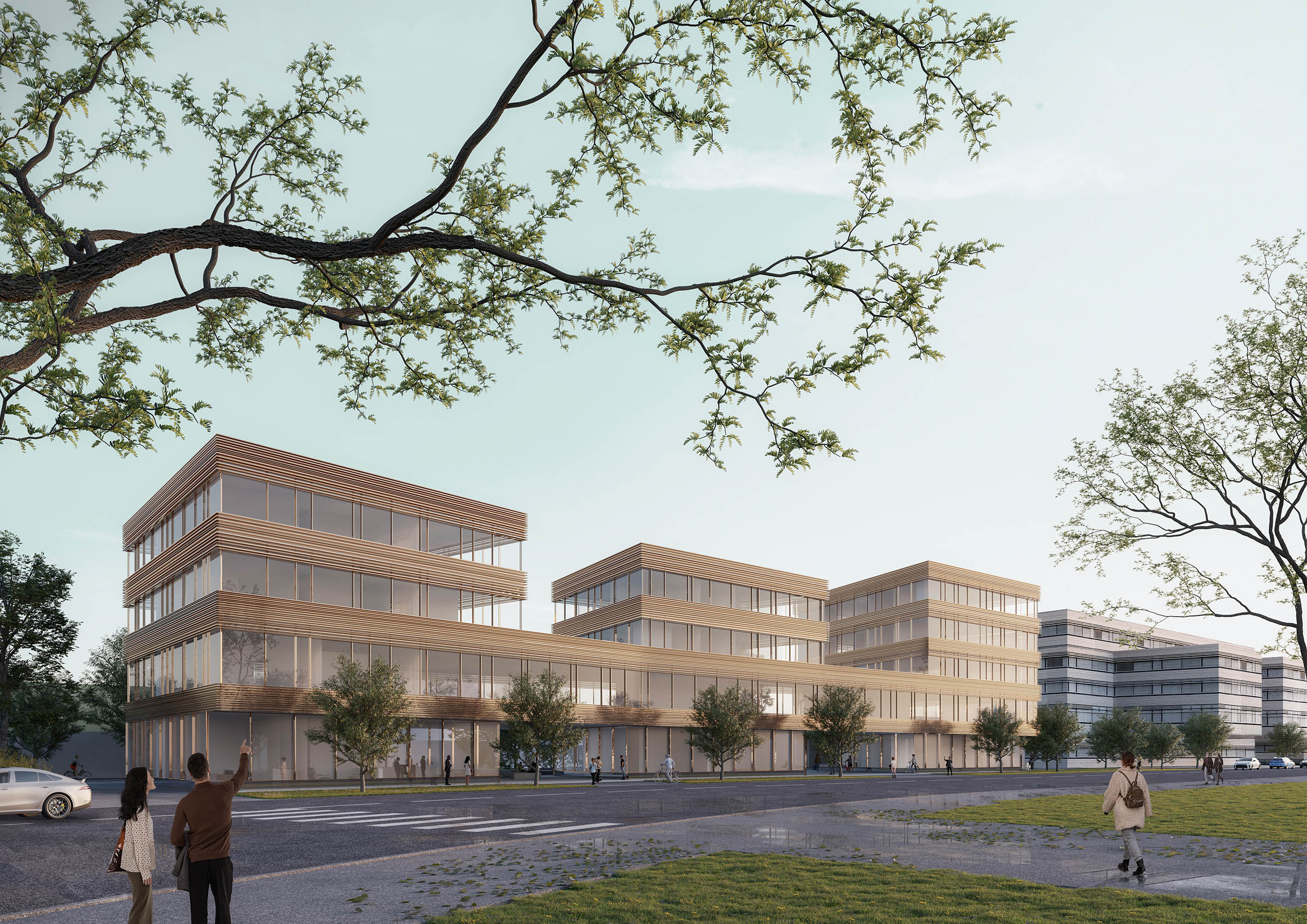 Die städtebauliche Konzeption mit drei konischen Einzelbaukörper und verbindendem ersten Obergeschoss erzeugt eine städtebauliche Schließung entlang der Sandgasse mit gleichzeitiger Offenheit zur dahinterliegenden Schule und dem Campus der TU. Der fünfgeschossige Baukörper schließt direkt an ein bestehendes Institutsgebäude an. Die weiteren Baukörper mit vier Geschoßen und kleineren Volumen reihen sich mit großzügigen Abständen entlang der Sandgasse auf. Mit den drei Baukörpern können den drei im Haus befindlichen Organisationseinheiten jeweils ein direkter Eingang zugewiesen werden. Die größere Geschosshöhe im EG wird für die Situierung von Seminarräumen, Foyers und Aufenthaltszonen genutzt. Der östliche Turm kann in allen Geschossen von den anderen Einheiten getrennt werden.