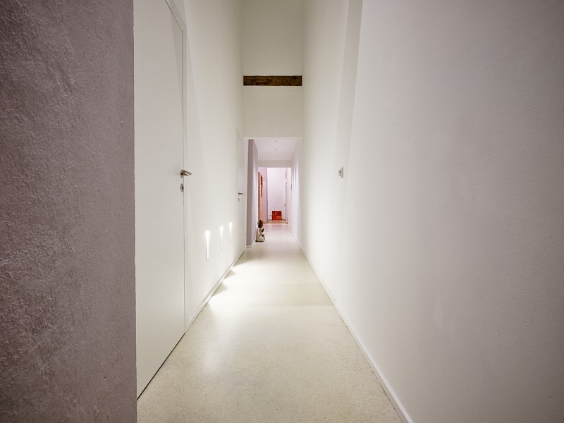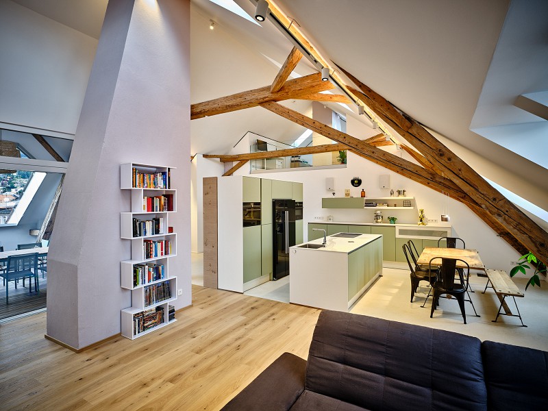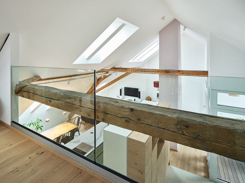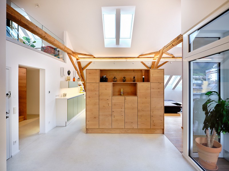 Bei diesem Projekt wurde auf ökologische und nachhaltige Baustoffe geachtet. Die Aussenwände im Bereich der Terrassen sind als Holzriegel ausgeführt, wobei die Zwischenräume mit Holzfaser-Einblasdämmung ausgedämmt wurden. Als Putzträgerplatten kamen Holzfaserdämmplatten zum Einsatz. Im Dachbereich wurde ebenfalls eine Holzfaser-Einblasdämmung verwendet. Die Aussenfassade solltenach Vorgabe der Stadtplanung unverändert bleiben und wurde innenseitig mit Steinwolle gedämmt. Die Fußböden aus Massivholzparkett und geschliffener Estrich aus Weißzement vom Attersee in Gängen und Küche prägen das Erscheinungsbild, die Nassbereiche sind mit Feinsteinzeug ausgestattet. Auch beim Innenausbau wurde als Material Holz von den Auftraggebern präferiert. Die Kamine wurden mit Sumpfkalk verputzt.