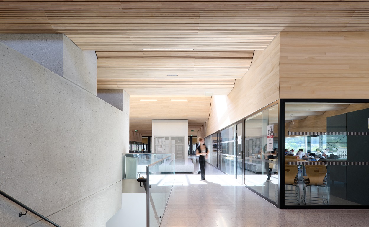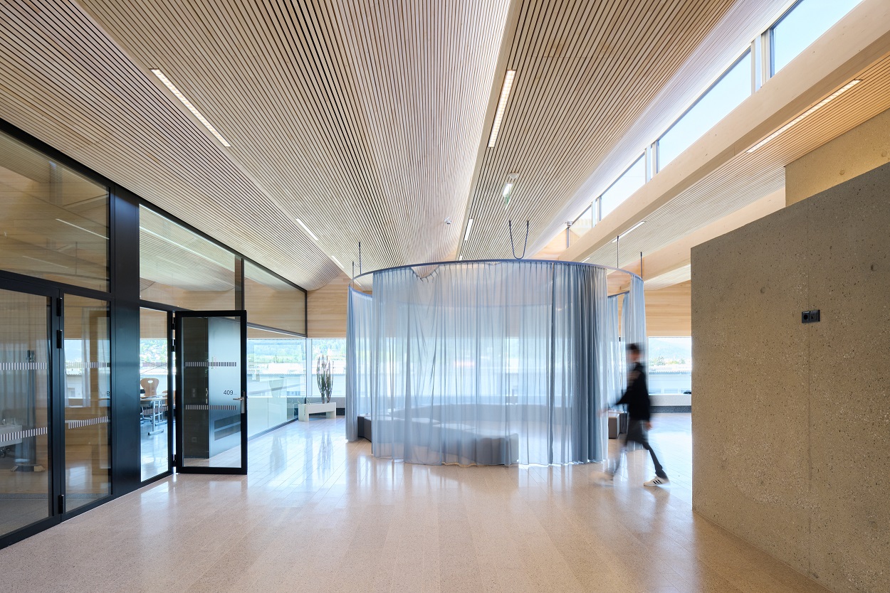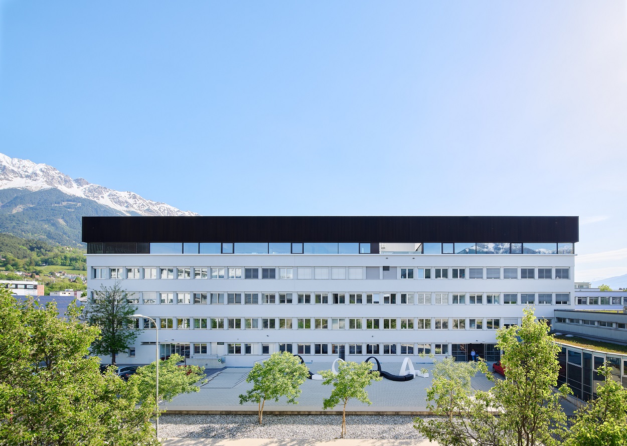 Die HTL Bau und Design stieß bereits an ihre Kapazitätsgrenzen. Also wurde das Dach des Siebzigerjahre-Schulgebäudes kurzerhand zum Grundstück erklärt und mit einer schwarzen Box aufgestockt. Das Raumerlebnis, sobald man sich durch die Zeitkapsel des alten Stiegenhauses ins fünfte Geschoß hochgearbeitet hat, ist ein luftig leichtes, von Licht und Luft durchflutetes. Über dem umlaufenden Fensterband entfaltet sich ein bis zu sechs Meter hoher Holzleichtbau aus Weißtanne mit einem sinnlichen, weich dahinwogenden Sheddach. Eingespeist wird die Energie über einen neu geschaffenen Fernwärme-Anschluss, der die bisherige Ölheizung ersetzt. Die Lüftungsanlage sorgt für beste Lernluft, dank automatischer nächtlicher Fensterlüftung starten die Maturant:innen auch im Sommer mit kühlem Kopf in den Schultag.