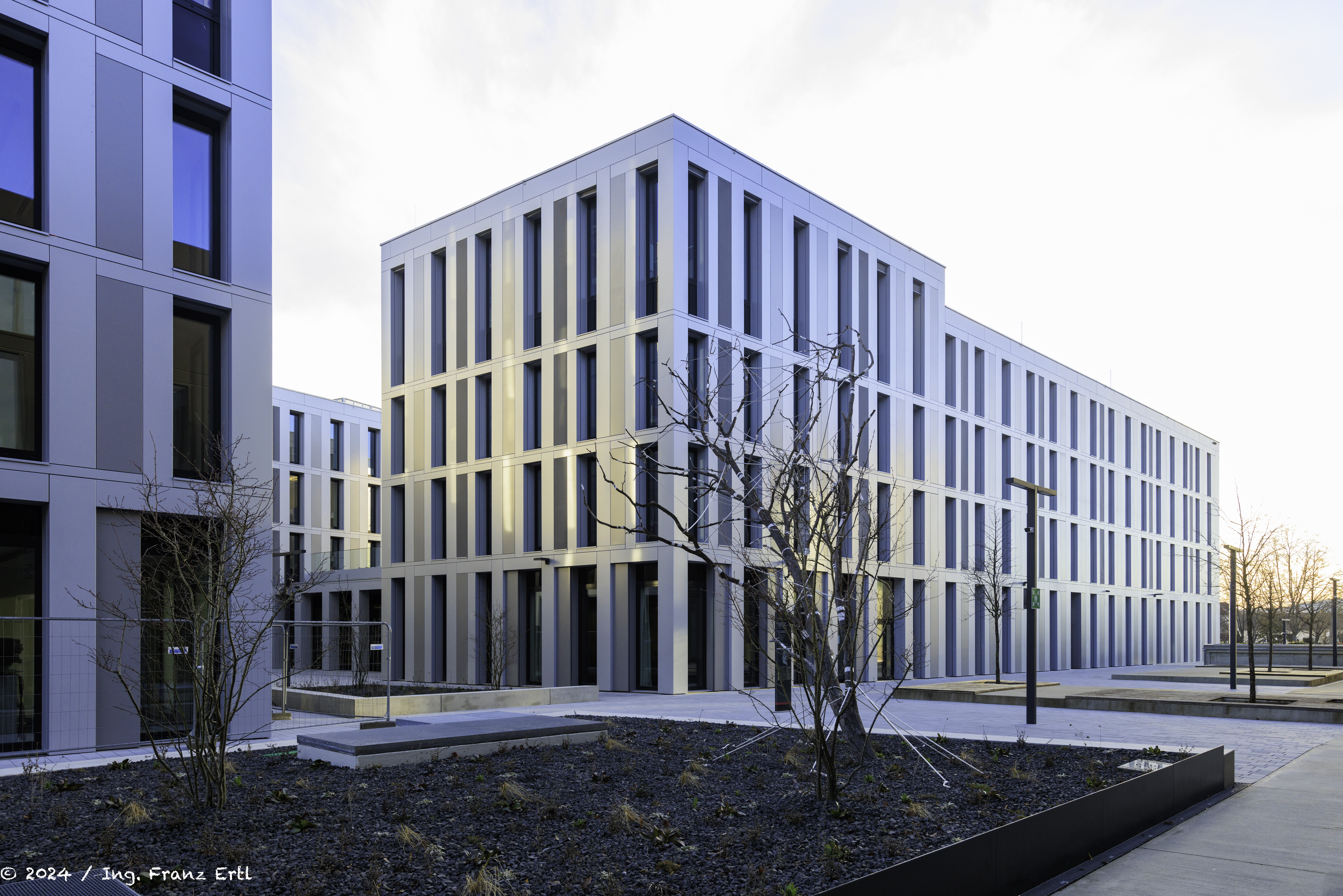 Die kompakten Baukörper richten sich in ihrer Positionierung und Höhenstaffelung nach der unmittelbaren Umgebung. Die fußläufigen Verbindungen werden vom bestehenden Campus weitergeführt und verbinden sich ganz logisch in einer neuen Campuspromenade.
