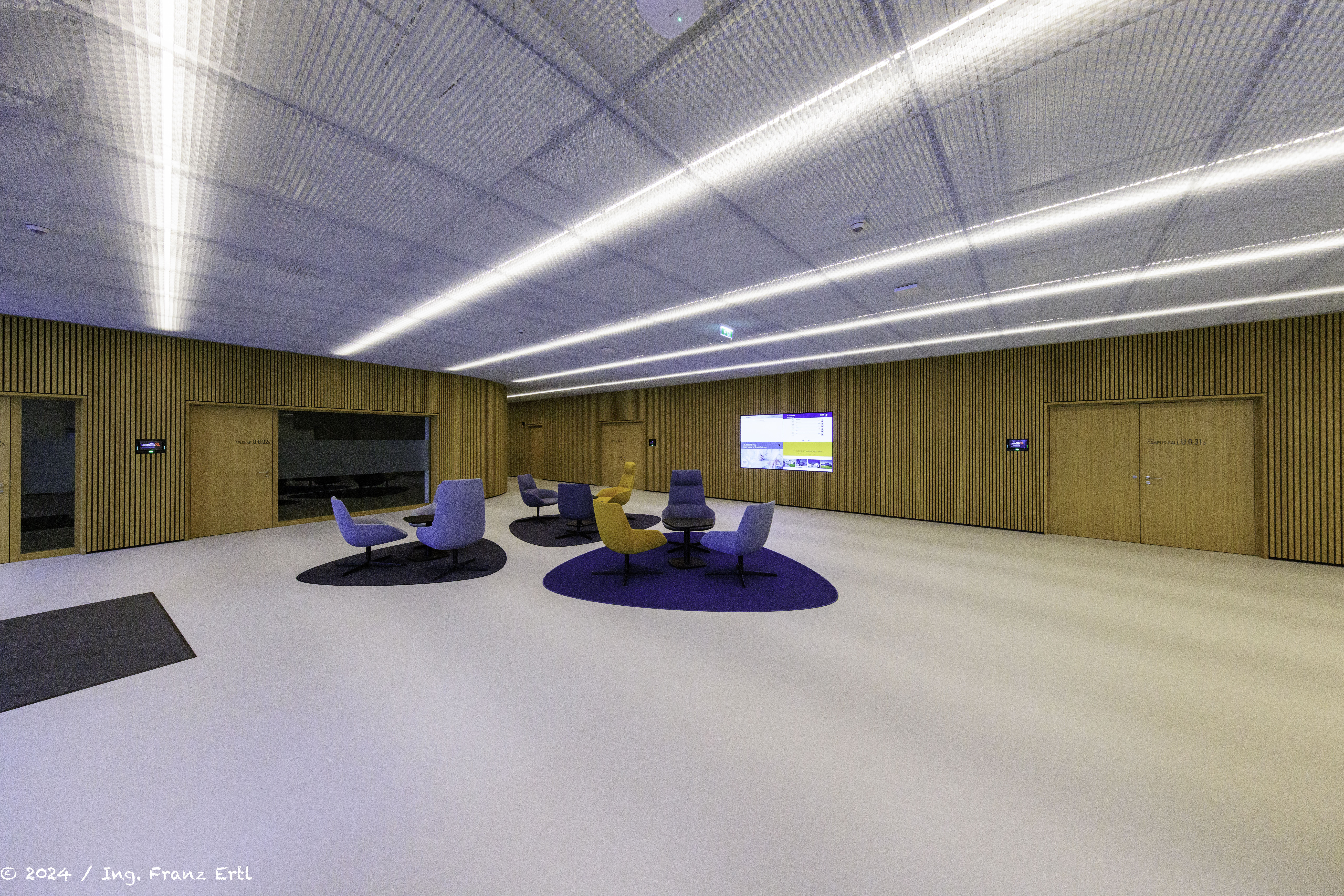 Die Ausgestaltung der plastischen Fassade erfolgt mittels hinterlüfteten Aluminiumkassetten welche ein Spiel mit Licht und Schatten entstehen lassen. Aluminium ist zu 100% recycelbar und dafür wird lediglich 5% der Herstellungsenergie als Primärenergie benötigt. Kombiniert mit der Verwendung von CEM III - Beton mit recyceltem Zuschlag und CO2 reduziertem Zement sowie der Verwendung von Holz im Innenausbau wird auf nachhaltige Baumaterialien gesetzt.