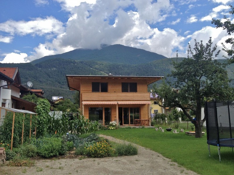 Südausgerichteter 2-geschossiger Holzriegelbau mit hinterlüfteter Lärchenfassade, Zellulosedämmung und kontrollierter Wohnraumlüftung.