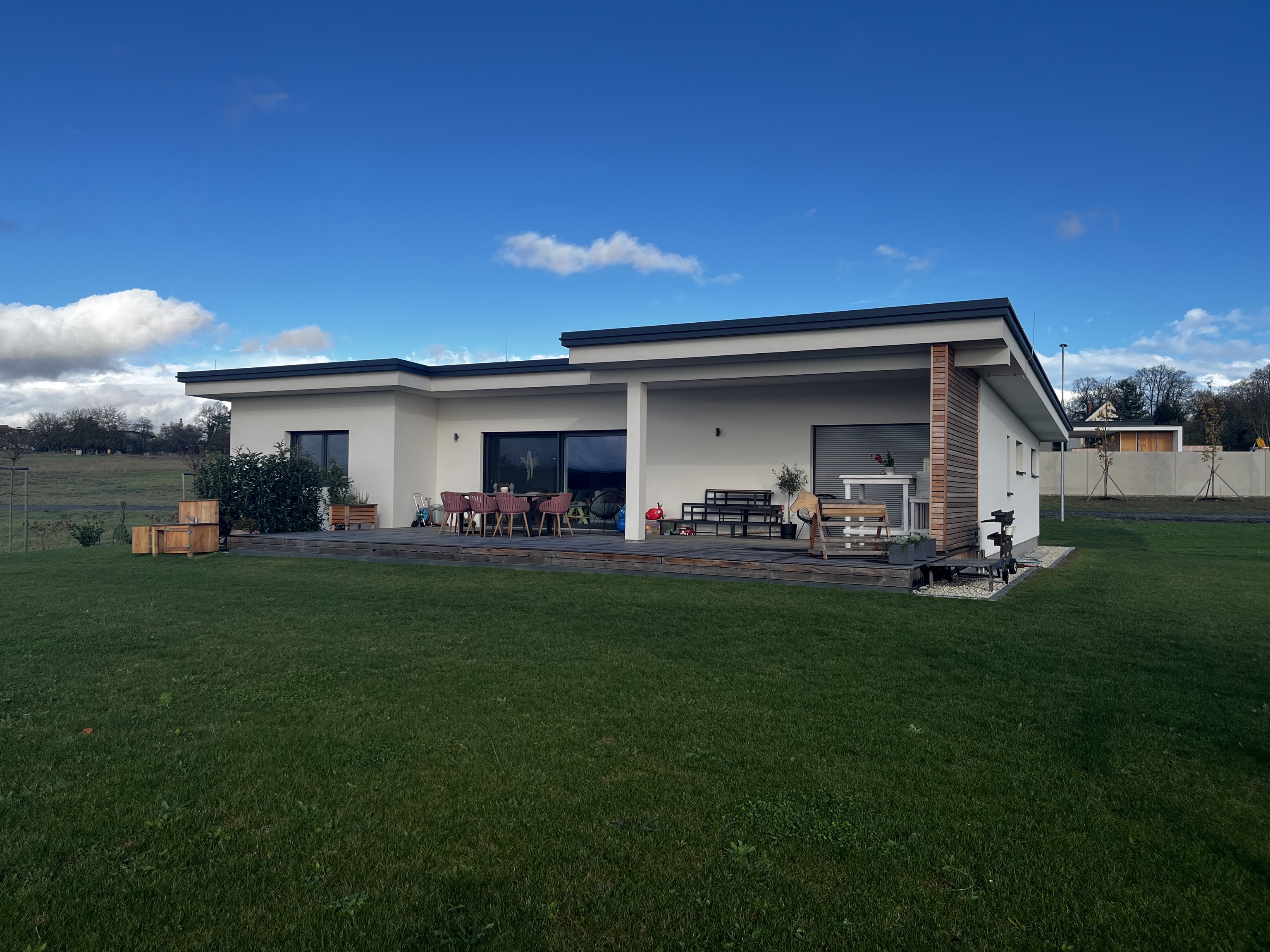 Das Einfamilienhaus in Großpetersdorf präsentiert sich als moderner, eingeschossiger Baukörper in konsequenter Holzriegelbauweise und setzt ein klares Zeichen für nachhaltige Architektur. Das charakteristische, elegant geneigte Pultdach mit einer Neigung von 2° unterstreicht die zeitgemäße Formensprache und ermöglicht zugleich eine optimale Integration der Photovoltaikanlage. Auch die Garage folgt dem konstruktiven Prinzip des Holzbaus und fügt sich harmonisch in das Gesamtbild ein. Bei der Materialwahl wurde größter Wert auf ökologische und wohngesunde Baustoffe gelegt: Neben Holzfaser- und Zellulosedämmungen kommen ressourcenschonende Funderplan Biofaserplatten zum Einsatz. So verbindet das Gebäude ein wegweisendes Energiekonzept mit hoher architektonischer Qualität und außergewöhnliche