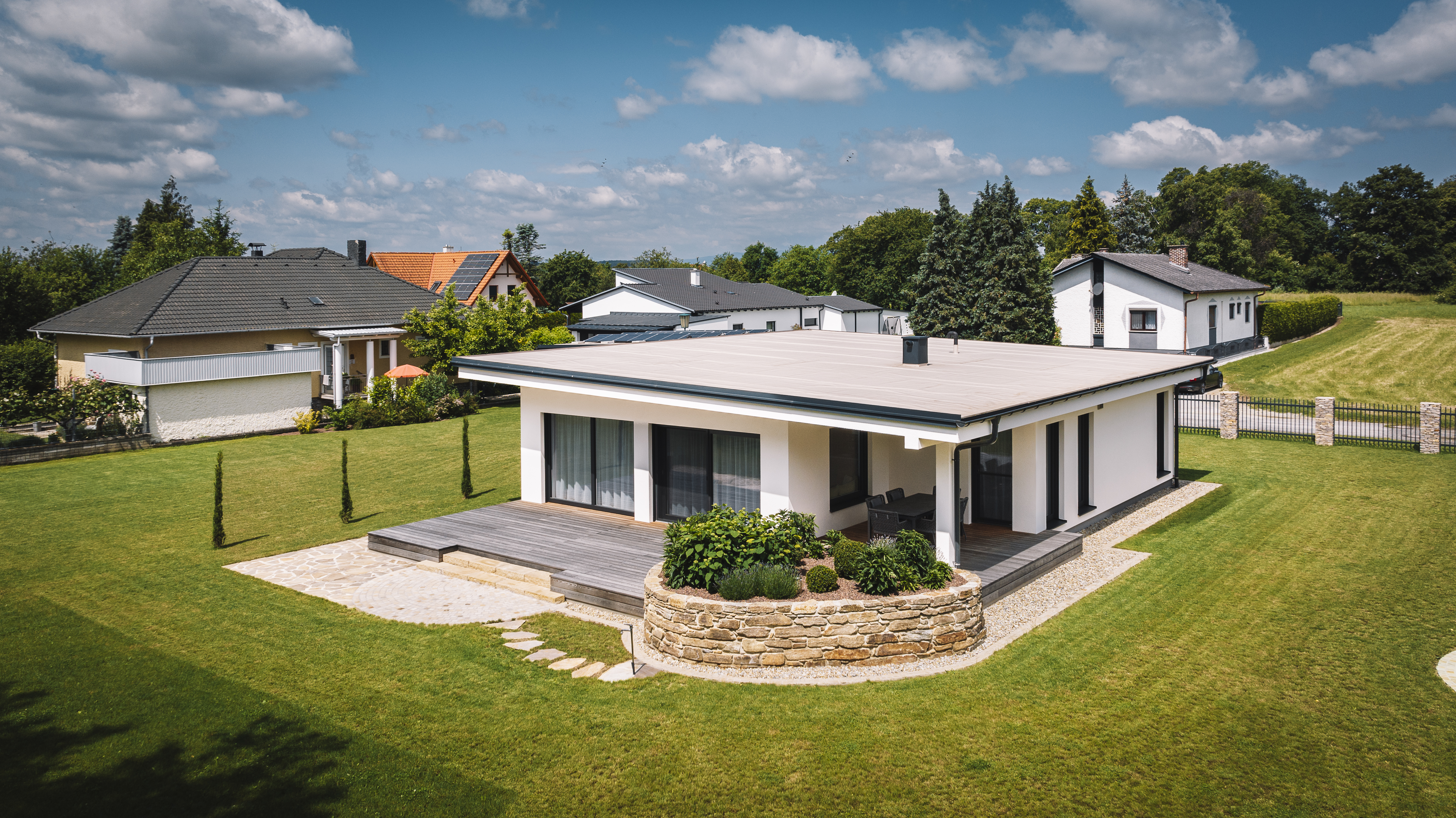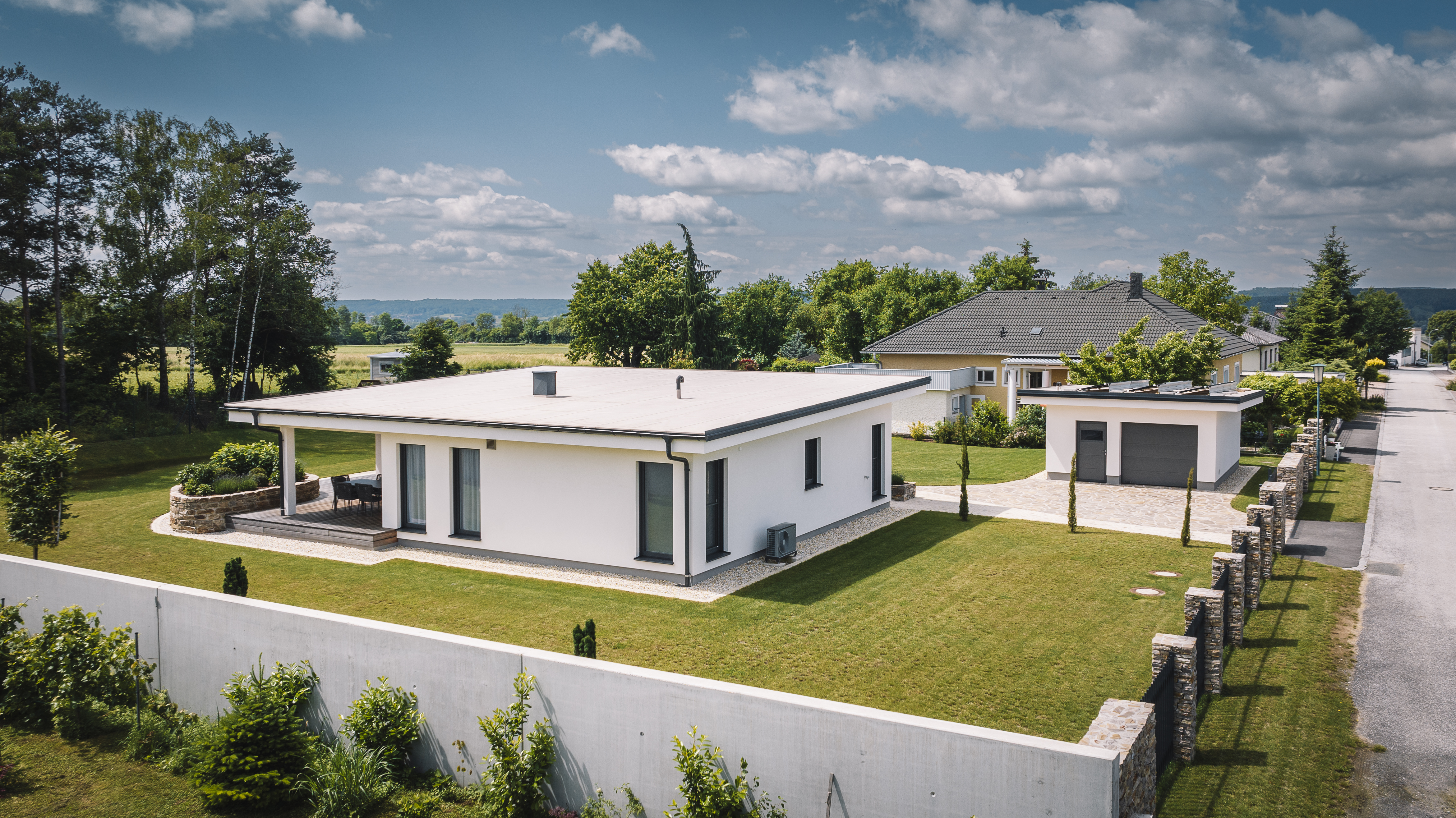 Das vorgestellte Einfamilienwohnhaus in Großpetersdorf ist ein eingeschossiges Gebäude in Holzriegelbauweise, ausgestattet mit einem innovativen Pultdach mit einer Neigung von 2°. Die zugehörige Garage, ebenfalls in Holzriegelbauweise, verfügt über das gleiche Pultdachdesign. Umweltfreundlichkeit und Nachhaltigkeit stehen bei diesem Projekt im Vordergrund. Neben der Verwendung von Holzfaser- und Zellulosedämmung wurde auch besonderer Wert auf ökologische Materialien wie Funderplan Biofaserplatten und Pullex hightec lasierende Holzteile gelegt.