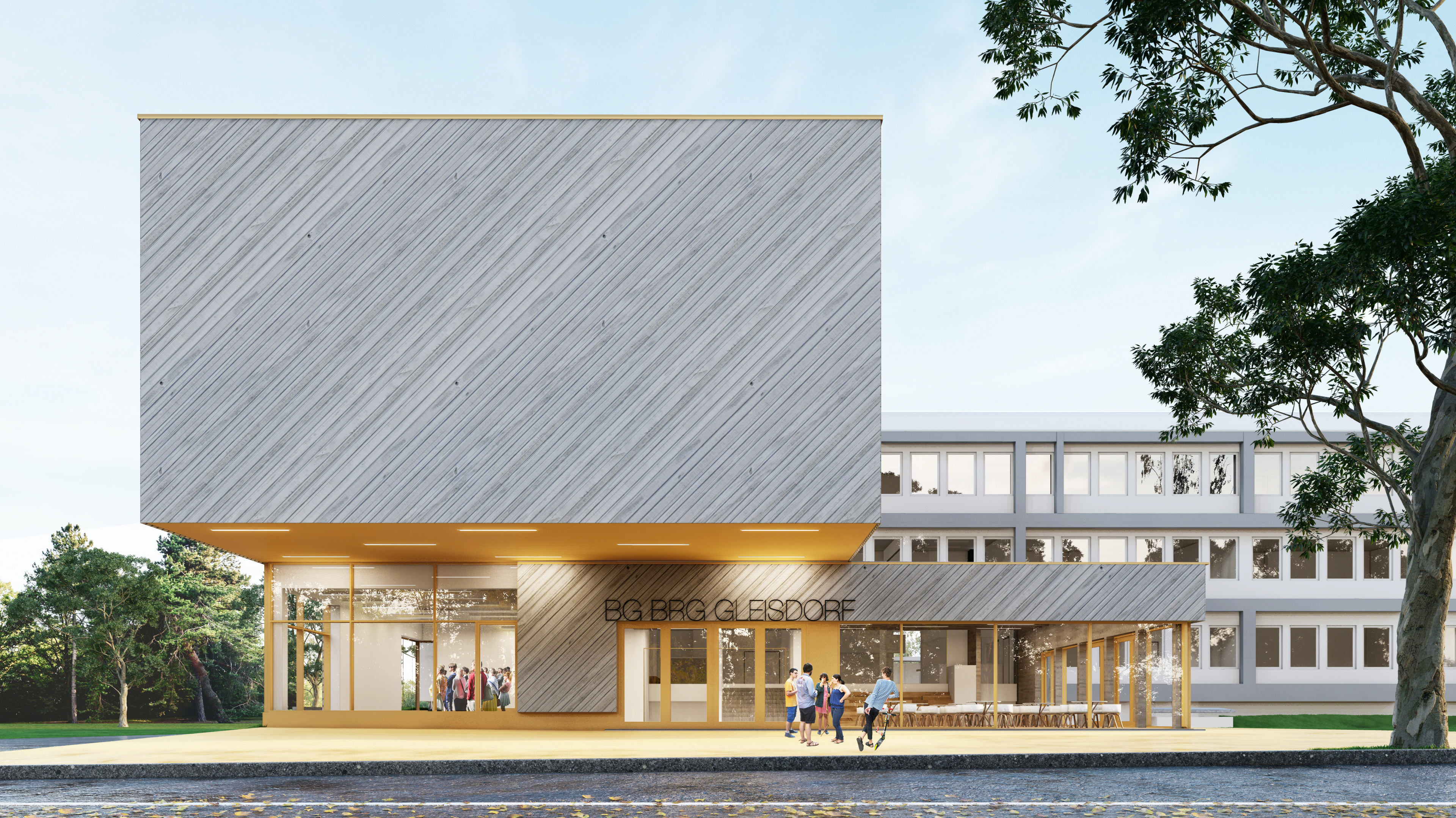 Der Zubau des BG Gleisdorf orientiert sich an der bestehenden Gebäudeflucht des Haus des Kindes an der Alois-Grogger-Gasse. Der freizügige halböffentliche Vorplatz sowie die daran anschließende transparente Aula geben dem schulischen Leben seine städtische Präsenz.