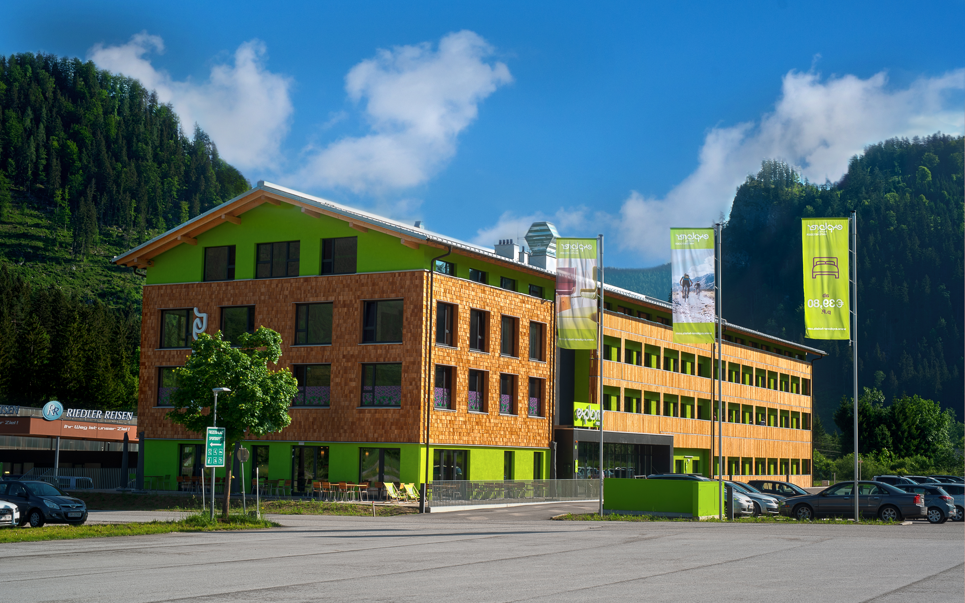 Komplexer 5-geschossiger Bau mit Giebeldach; verkleidet mit Holzelementen und Holzschindeln mit darunter liegendem Wärmedämmverbundsystem in Passivhausqualität. Moderne Formensprache, die sich in das alpenländische Landschaftsbild sehr gut einfügen lässt.