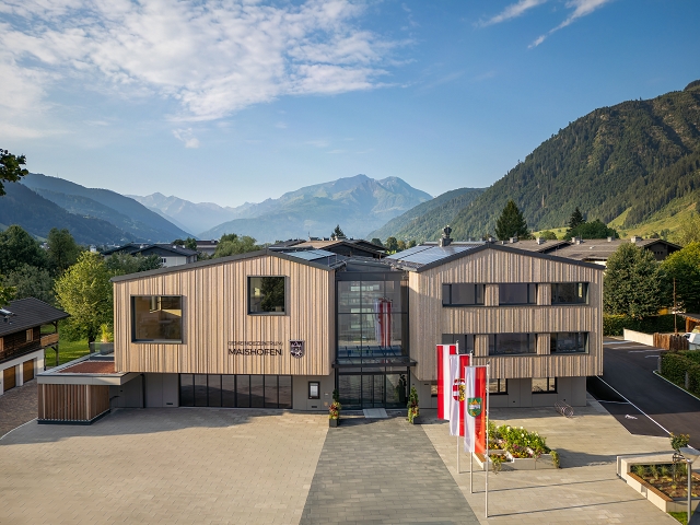 Das neue Gemeindezentrum wurde auf einer Fläche mitten im Ortszentrum von Maishofen errichtet. Nun konnte eine moderne, lichtdurchflutete und vor allem barrierefreie Bürgerservicestelle entstehen, die einen Meilenstein in der Entwicklung der Gemeinde Maishofen markiert. Es wurde ein kreativer Raum geschaffen, der neben den Verwaltungsaufgaben auch den informellen Austausch in der neuen Gemeindebücherei, dem Atrium sowie in den Mehrzweckräumen fördert. Im offenen Atrium sind die zwei Baukörper durch Freitreppen und Brücken miteinander verbunden. Mit Holzböden, Holzfassaden sowie Wand- und Akustikdeckenverkleidungen aus Holz wurde eine hochwertige und ökologische Ausstattung gewählt. Die Grundwasserwärmepumpe, in Kombination mit einer 84 kWp Photovoltaikanlage runden das Projekt ab.