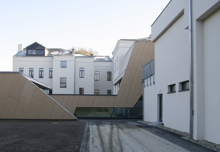 den Bestand eingebaut. Im OG wurden ein Mehrzweckraum mit Lager sowie der Hort adaptiert, im DG ein neuer