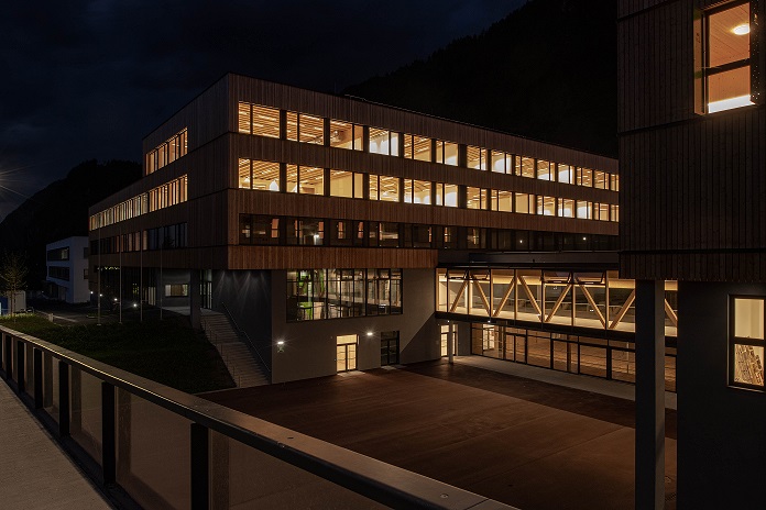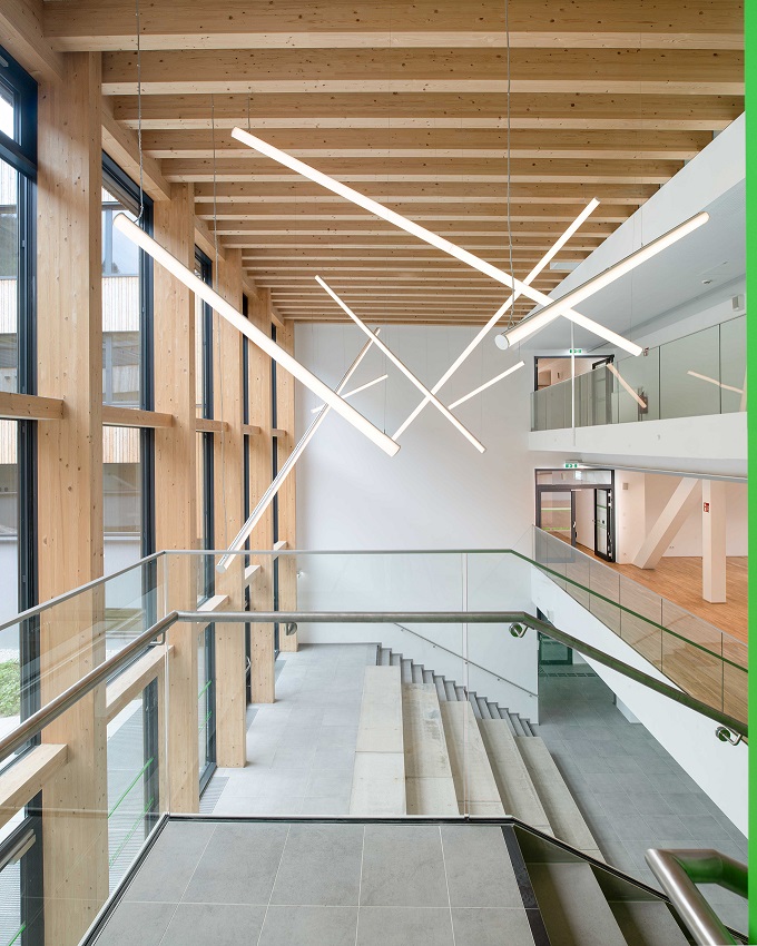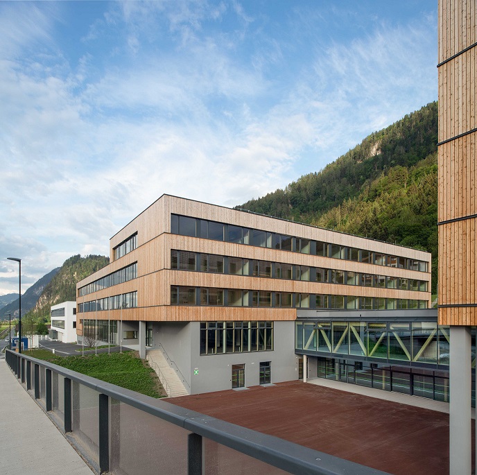 Die vorgefertigten Fassadenelemente bestehen aus unbehandelten vertikalen Lärchenholzlatten mit hochwertigen Holz-Alufenster. Alle Klassenzimmer, sowie die Gänge im Theoriebereich werden mit Holzbelägen ausgestattet.