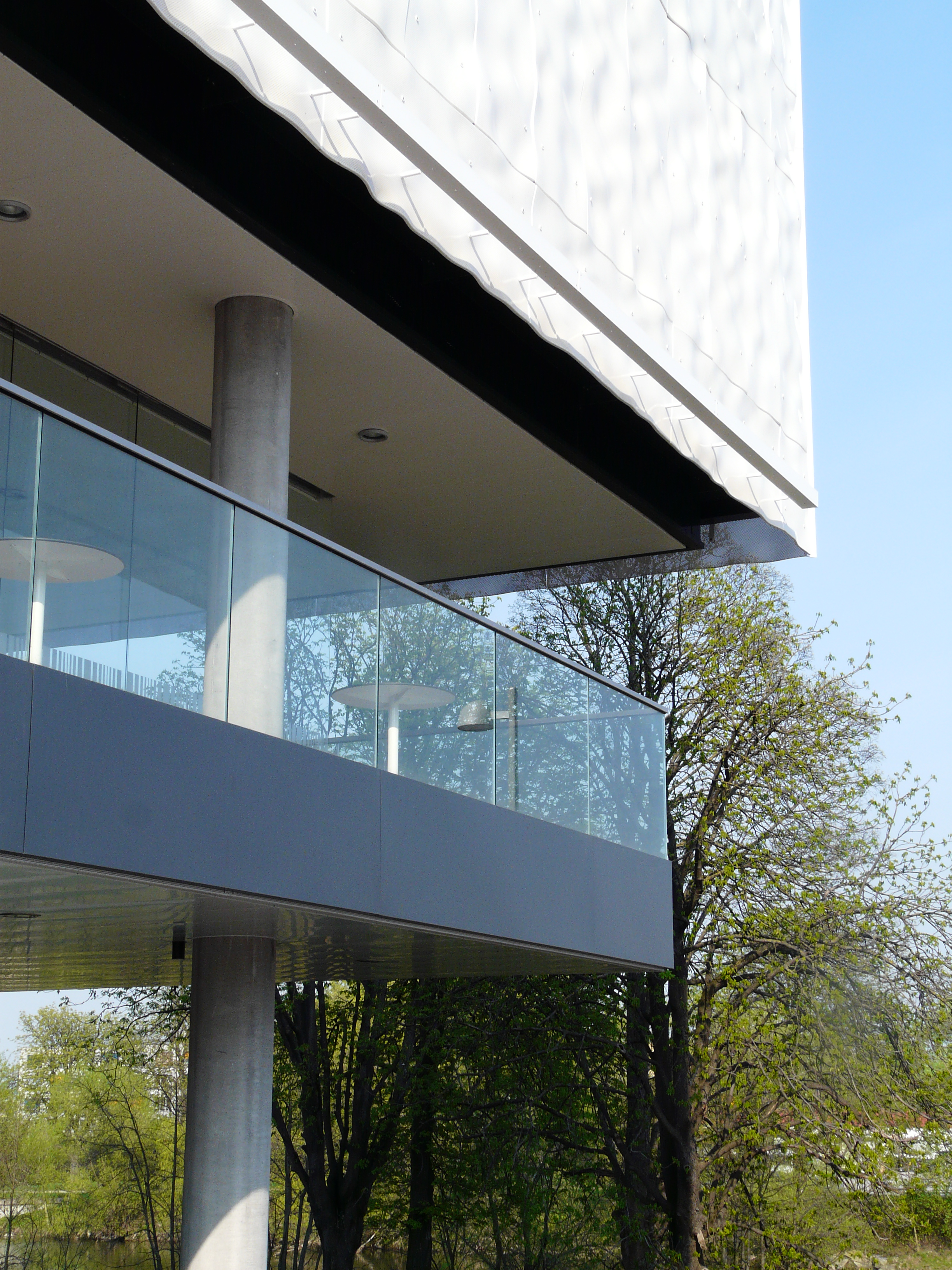 1.Obergeschoss: Im 1. Obergeschoss befindet sich das Restaurant (mit großer in Richtung Traisen gerichteter Fassade) und die Küche samt den erforderlichen Nebenräumen. Hier schließen die mit flexiblen Schiebewänden ausgestatteten Besprechungszonen an. Im westlichen Gebäudeabschnitt sind Büroräumlichkeiten angeordnet. Ein Teil dieser Büros gruppiert sich um den von diesem Geschoss aus begehbaren begrünten Innenhof.