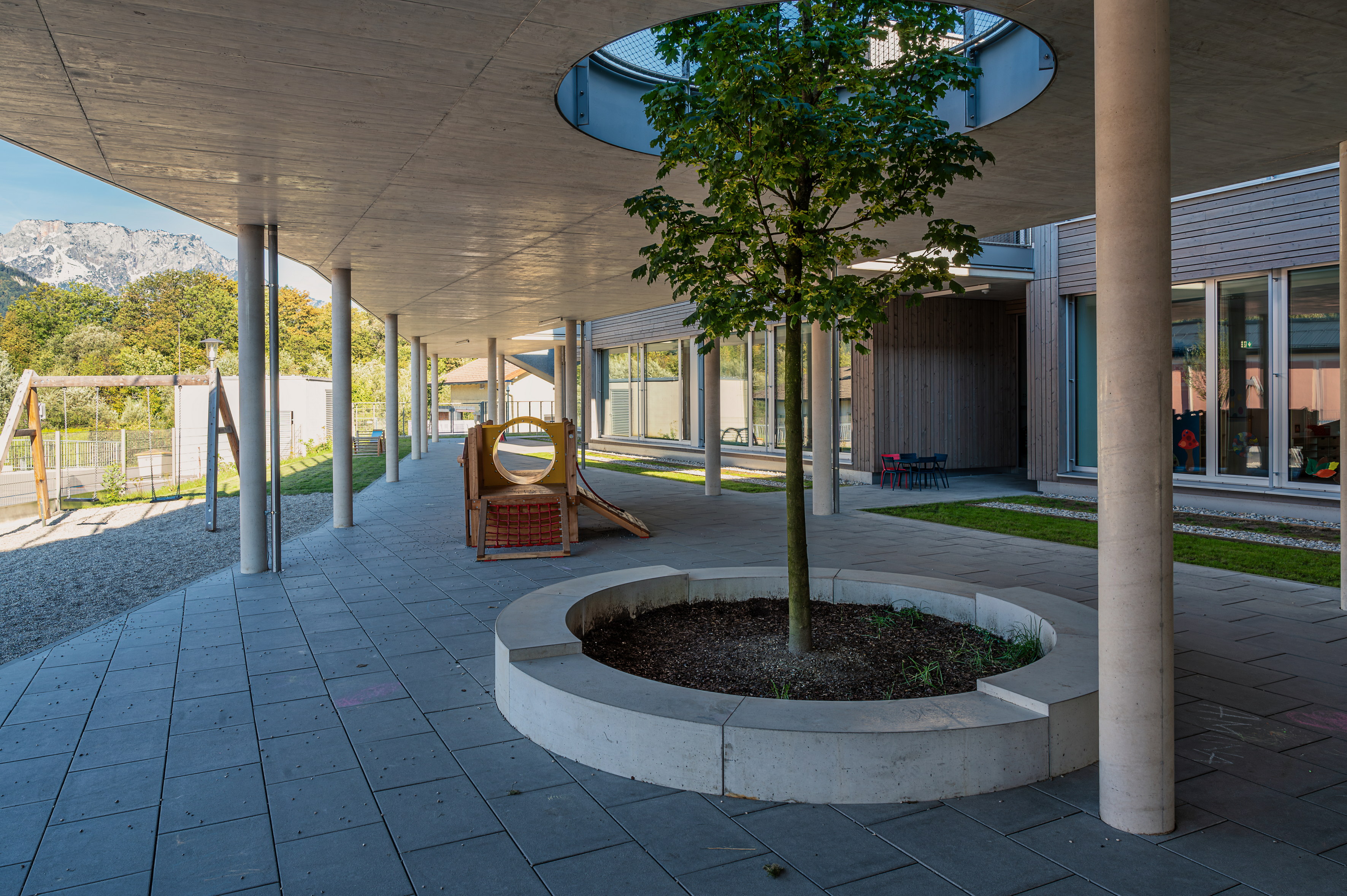 Unterschiedliche Freiraumqualitäten (Spieldeck, Terrasse, witterungsgeschützte Bereiche, Hofsituation, usw.) ermöglichen eine ganzjährige Nutzung des Außenraumes.