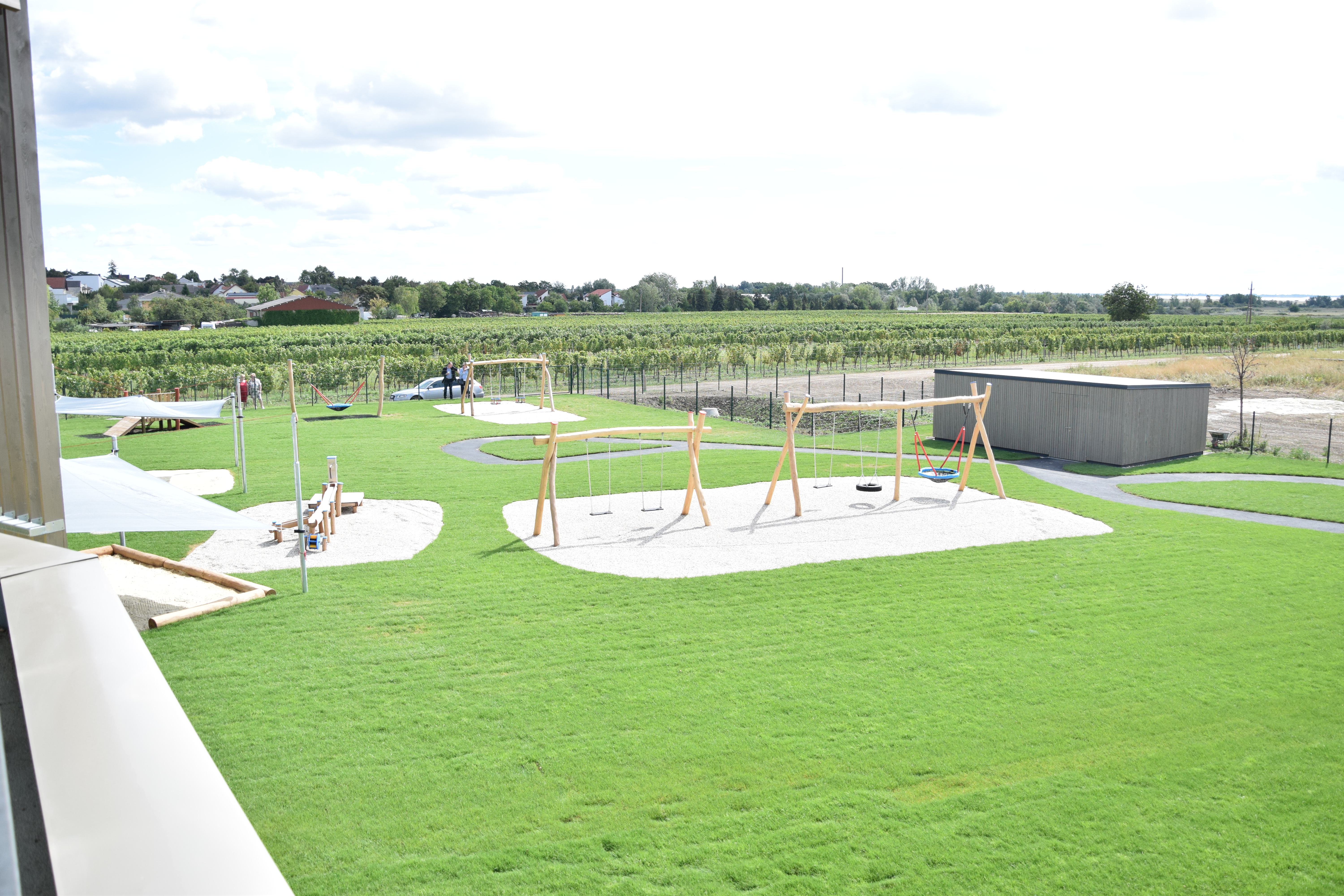 Vorgelagerte, gedeckte Freiräume bilden eine natürliche Erweiterung der Gruppenräume, selbst das Obergeschoß ist über den „Weinhügel“ an den Garten angebunden.