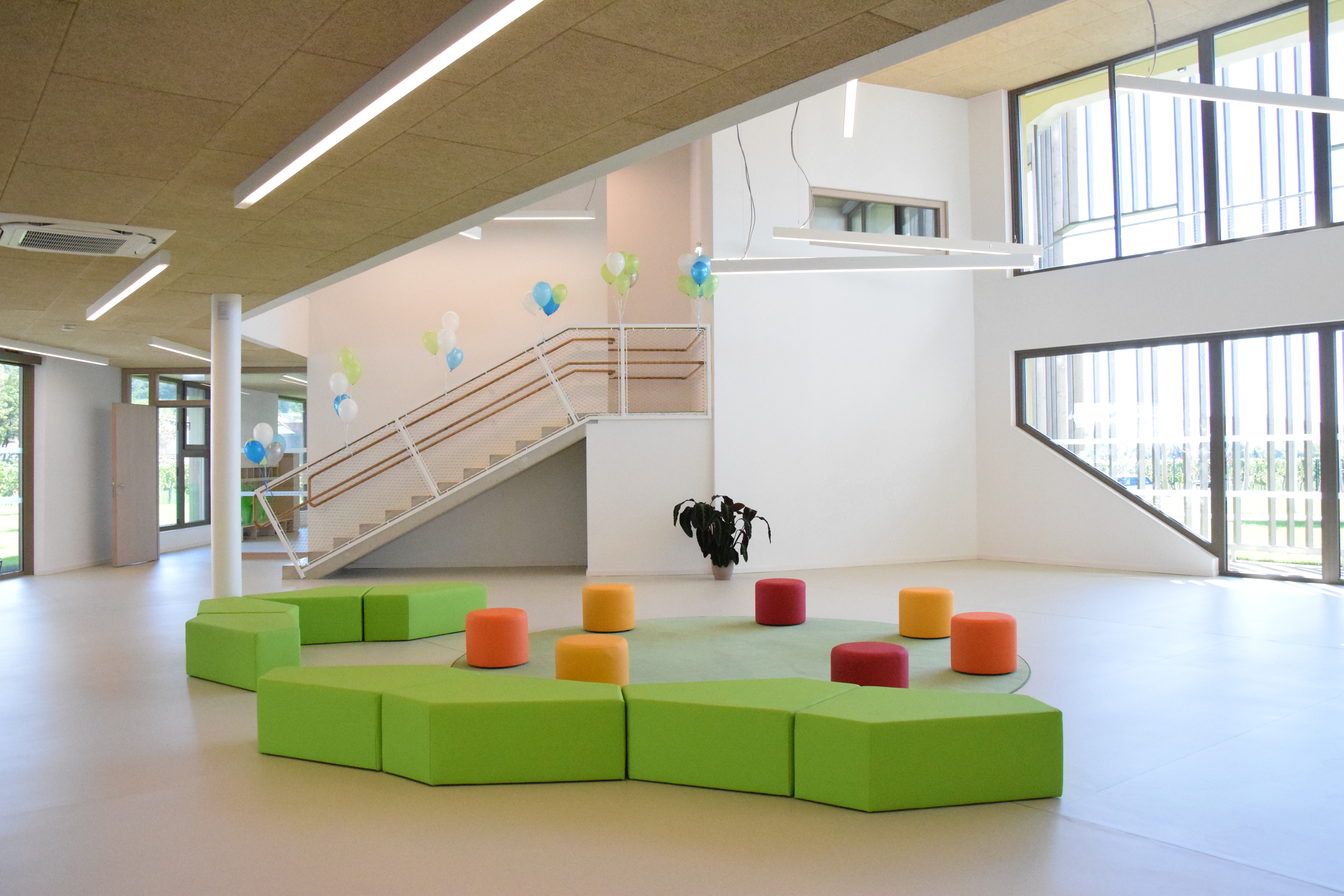 Die Positionierung des Gebäudes schafft einen differenzierten, windgeschützten Freiraum im Süden. Im Inneren bildet das „Wohnzimmer“ den zentralen zweigeschossigen Verteiler, von dem sämtliche Räume über kurze Wege entlang der offenen Spiel- und Bewegungszonen erreichbar sind, zusätzliche Spiel- und Lernwerkstätten erweitern das Raumprogramm.