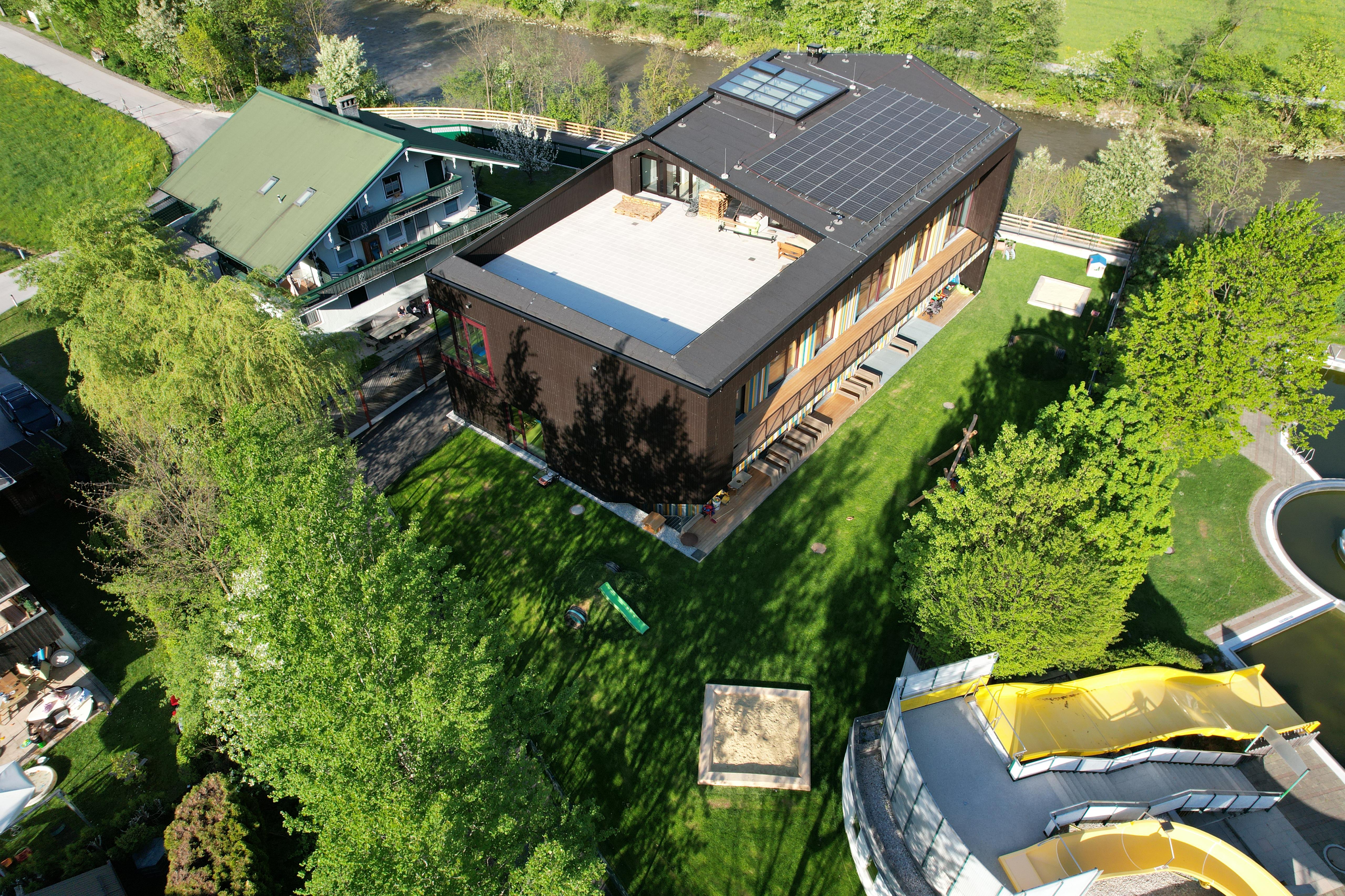 Das Gebäude wird als kompakter, hochgedämmter Massivbau errichtet, um den geforderten hohen Standards des Schall- und Wärmeschutzes gerecht zu werden. Im lichtdurchfluteten Innenraum unterstreichen helle Naturmaterialien die kinderfreundliche, warme Atmosphäre. Die schützende, dunkle Hülle des Baukörpers wird in der Erdgeschoßzone wo nötig und sinnvoll aufgeschnitten. Die dahinterliegende Schicht ist kindlich, verspielt und bunt. Im Inneren präsentiert sich ein offener Raumfluss, der durch die geschlossene Außenhaut nicht