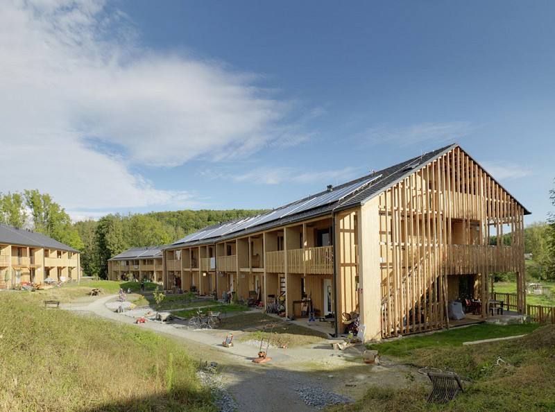 3 Häuser,28 Wohnungen, mehrere Nebengebäude, 70 Menschen. Eine kleine Siedlung, autofrei mit ganz normalen, klein und einfach gehaltenen Wohnungen in Holzbauweise, PV-Anlage, Batteriespeicher und Hackgutheizung.