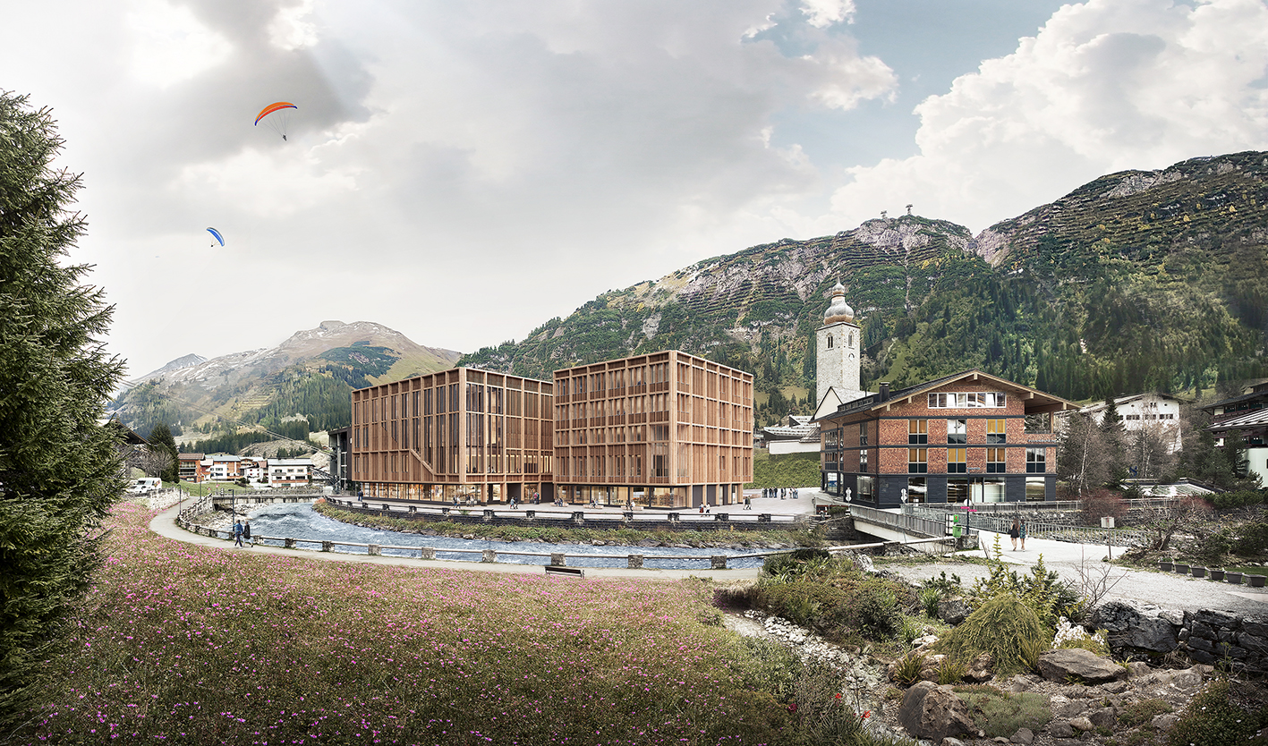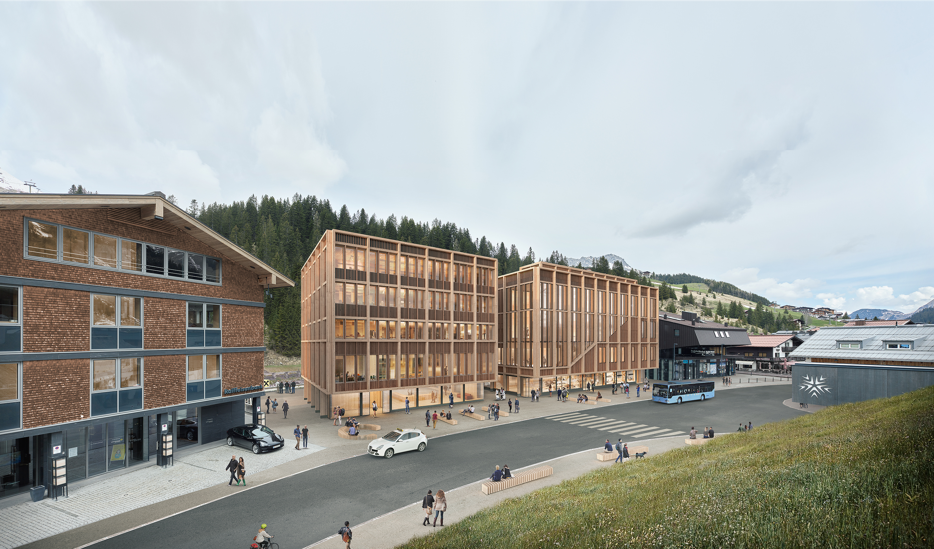 Zwei neue, gleichhohe Gebäude bilden mit der bestehenden Anhöhe der Kirche St. Nikolaus einen Dorfanger, welcher einen erlebbaren kommerziellen Knotenpunkt schafft. Sie dienen unterschiedlichste Interessensgruppen, die in starken ortsräumlichen und nutzungsübergreifenden Bezügen stehen und trotzdem selbständige Einheiten bilden.
