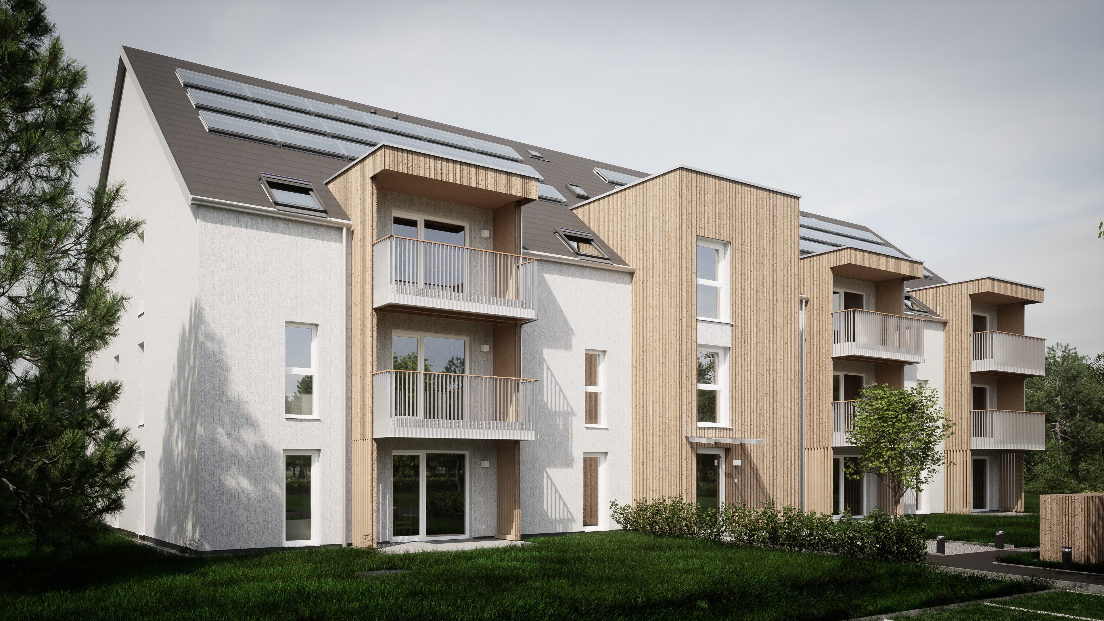Bei dem Projektkonzept und dem Energie- und Ressourcenmanagement wurde ein besonderes Augenmerk auf die Ökologie in Zusammenhang mit der Leistbarkeit für den Endverbraucher gelegt. Das Dachgeschoß welches bisher als 3. bzw. 4. Vollgeschoß ausgeführt wurde, wurde auf Grund der umliegenden zentrumsnahen dörflichen Struktur der Gemeinde Pasching auf ein ausgebautes Dachgeschoß mit Satteldachform adaptiert, sodass sich das Gebäude auch nachhaltig mit dem Kontext arrangiert. Das Gebäude wird als Holzmassivbau mit Putzfassade errichtet. Als Dämmung kommt eine ökologische Holzfaserdämmung zum Einsatz. Nicht tragende Innenwände sind als Trockenbau projektiert.