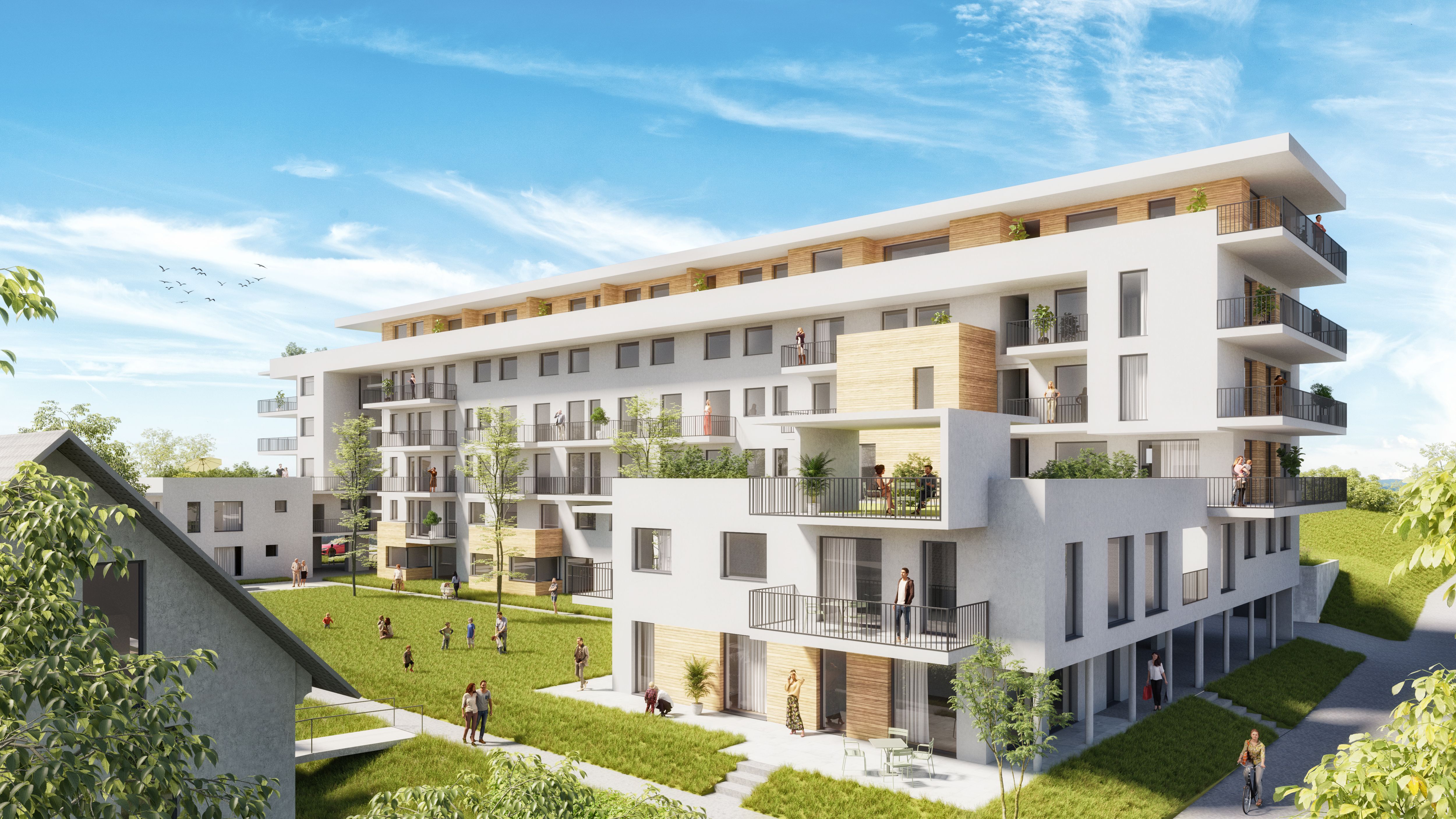 Das Neubauprojekt stellt einerseits formal einen Abschluss der Siedlung zur Bundesstraße hin her und soll andererseits über eine Durchwegung zwischen Wohnbauten und Bushaltestelle als Bindeglied wirken.