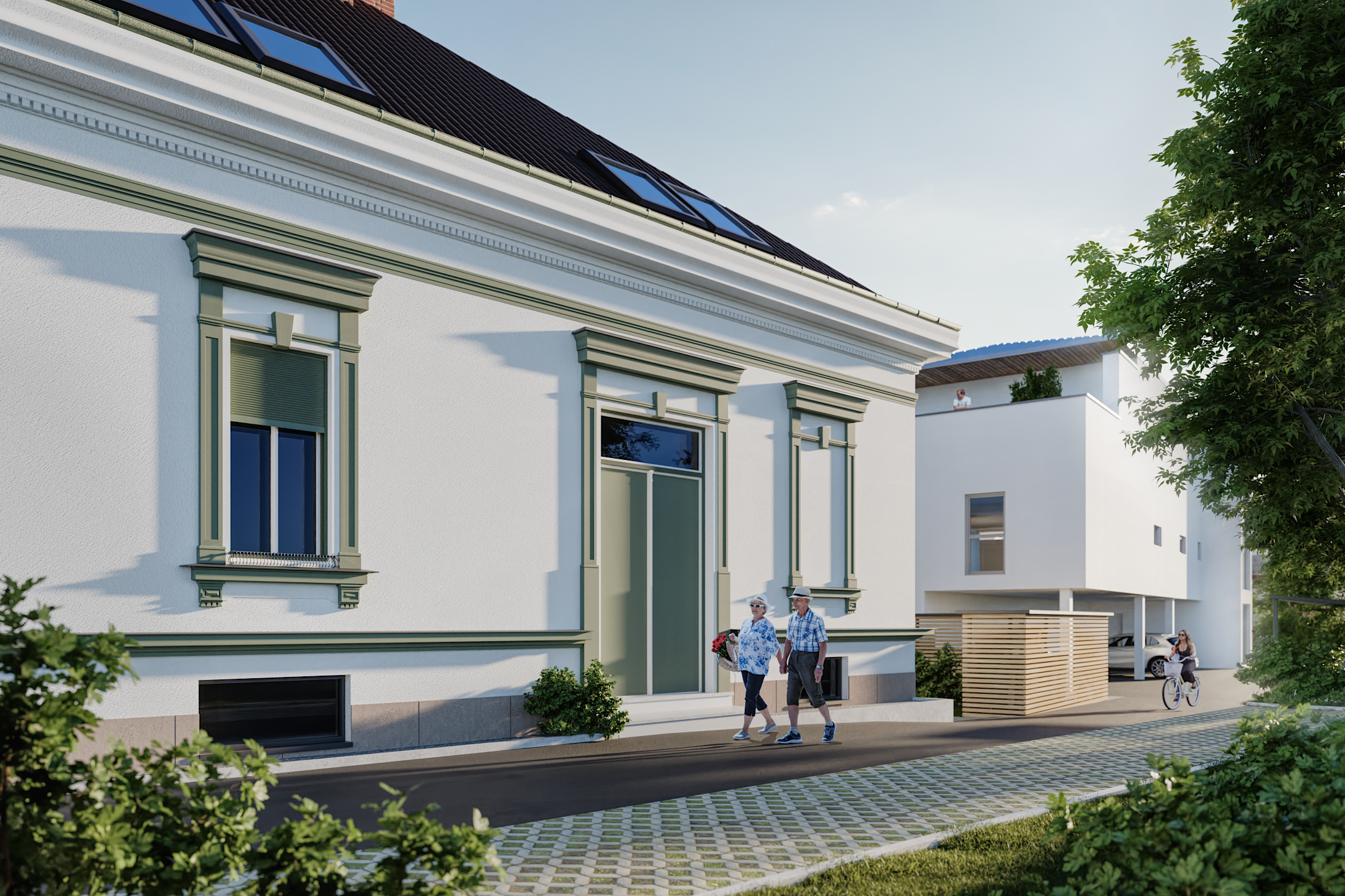 Das Gebäude wird im großen Garten einer Bestandsvilla entlang der Kärntnerstraße positioniert. Das Gebäude wirkt als Schallschutzmauer für das dahinterliegende Quartier.