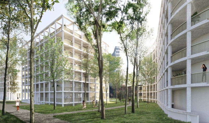 Drei neue Geschosswohnhäuser generieren zusammen mit dem Styria Media Center eine neue Gebäudefamilie, die sich in eine fließende Parklandschaft situiert. Die Formensprache der drei neuen Häuser orientiert sich an der bereits bestehenden Gebäudestruktur der Styria und stärkt damit den Eindruck eines neuen Ensembles, ohne dabei in Konkurrenz zu treten. Um die Punkthäuser, die ein von oben natürlich belichtetes, innenliegendes Stiegenhaus besitzen, wickelt sich ein Fassadenmantel aus umlaufenden Balkonen und Stützen.