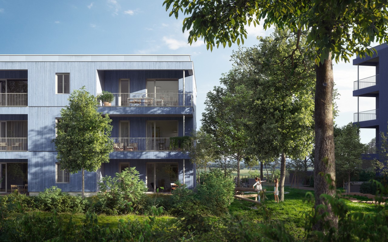 An Stelle eines alten Supermarkts wird ein Wohnbau in Holzbauweise errichtet. Um sich in die umgebende Struktur einzupassen verteilen sich die Wohnungen auf zwei Bauteile unterschiedlicher Höhe. Ihre Positionierung auf dem Grundstück garantiert ruhige Wohnungen und sonnige private Freiräume – bei gleichzeitig qualitätsvollen Gemeinschaftsflächen. Grundsätzlich sind die einzelnen Etagen als Regelgeschoße mit Zwei-, Drei- und Vierzimmerwohnungen konzipiert. Die der Bauweise inhärente Flexibilität, gepaart mit einer kompakten Schachtstruktur, lässt eine Um- oder Neuorganisation der Grundrisse zu und ermöglicht die Anpassbarkeit an eine andere Nutzung oder veränderte Wohnumstände. Eine Raumhöhe von drei Metern erhöht die Wohnqualität und gewährleistet alternativ auch eine Anpassung an eine Büronutzung.