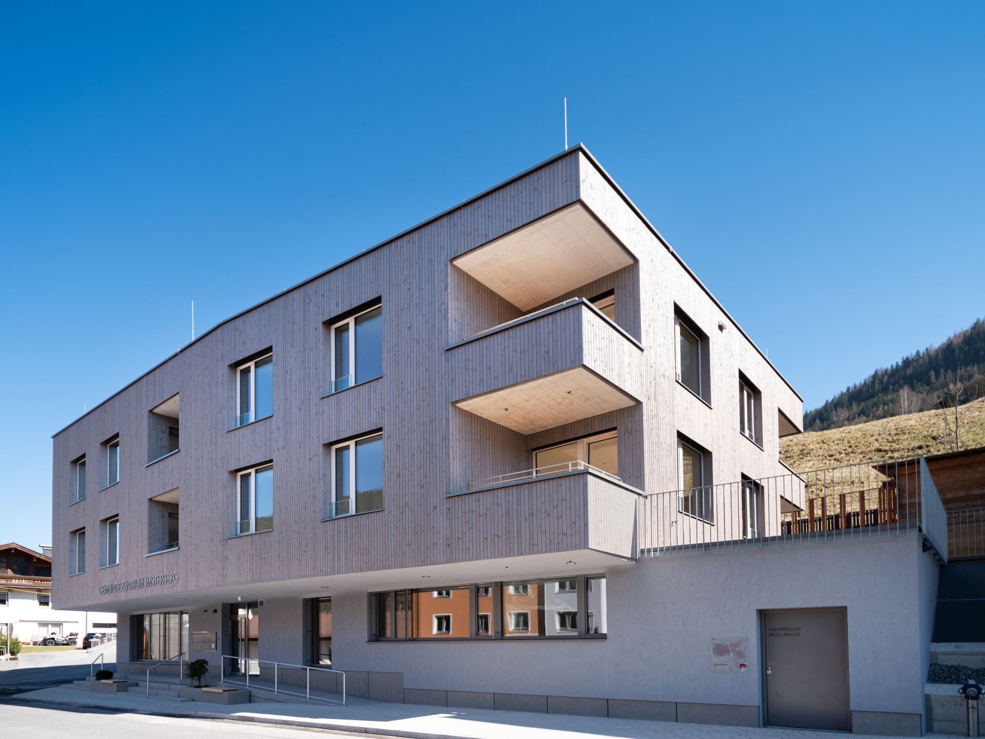 Der Baukörper über dem Untergeschoss, gliedert sich in das Gemeindehaus (im Erdgeschoss) und einen, über das Erdgeschoss nordwestlich hinausragenden Wohntrakt. Der überdachte Außenbereich, ausgebildet mit Rampen und Treppen, führt zum Haupteingang des Gebäudes, welches zum Straßenraum leicht angehoben wurde. Das Gemeindehaus kann vom zentralen Treppenhaus aus betreten werden. Im Erdgeschoss befinden sich auch die separat erschlossenen Nebenräume, wie Fahrrad- Müll und Technikraum. In den 2 Obergeschoßen wurden insgesamt 4 2-Zimmer-Wohnungen und 4 3-Zimmer-Wohnungen mit Loggien errichtet. Das Gebäude ist mit einem Flachdach gedeckelt, jedoch wurde die Attika schräg/mit unterschiedlicher Höhe ausgebildet.