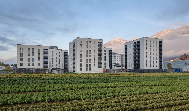 Österreichs größtes Passivhaus PLUS-Wohnquartier mit zukunftsweisender, höchst energieeffizienter Bauweise und maximaler Einbindung erneuerbarer Energien an den Gebäuden samt umweltfreundlichen Batteriespeichern konnte in Rum bei Innsbruck errichtet werden. Fünf rechteckige Baukörper mit in Summe 134 Wohnungen wurden gleichmäßig über das Grundstück verteilt und in der Höhe, von Norden nach Süden gestaffelt.