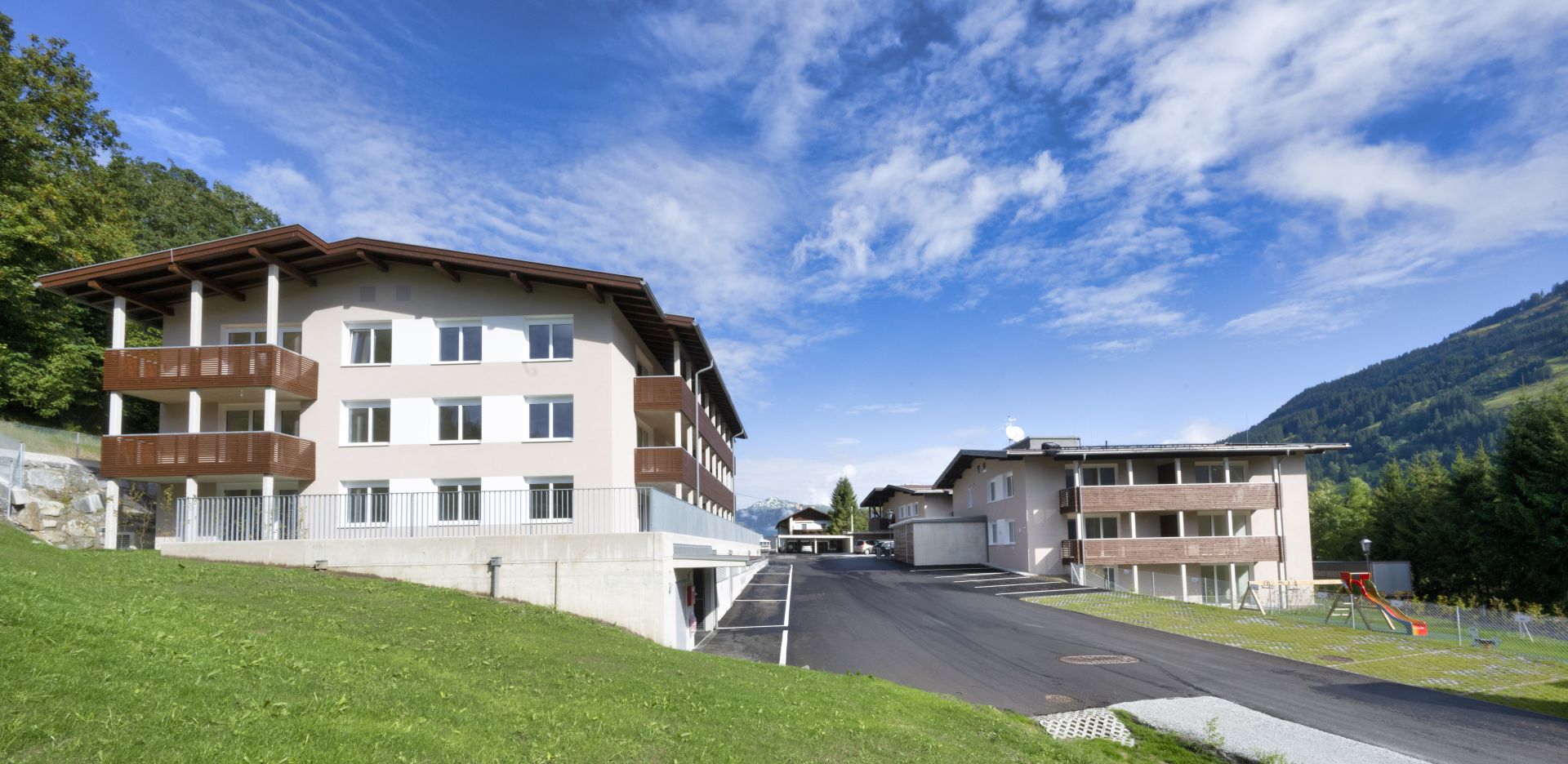 Die NEUE HEIMAT TIROL errichtete in Jochberg nach Abbruch bestehender Baukörper in einem Teilbereich der Südtiroler Siedlung eine neue Wohnanlage (Haus 2 mit 8 und Haus 3 mit 15 Mietwohnungen).