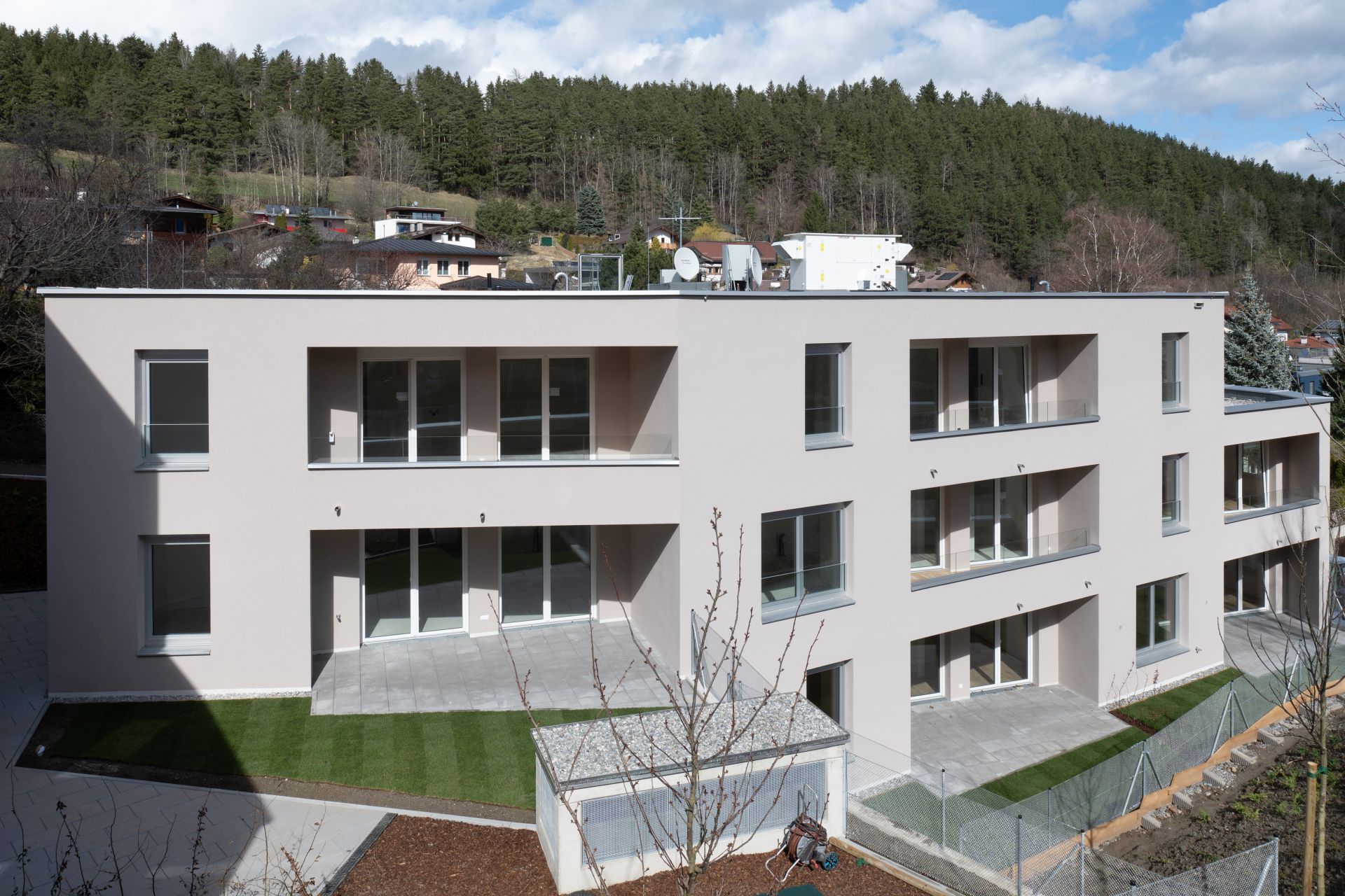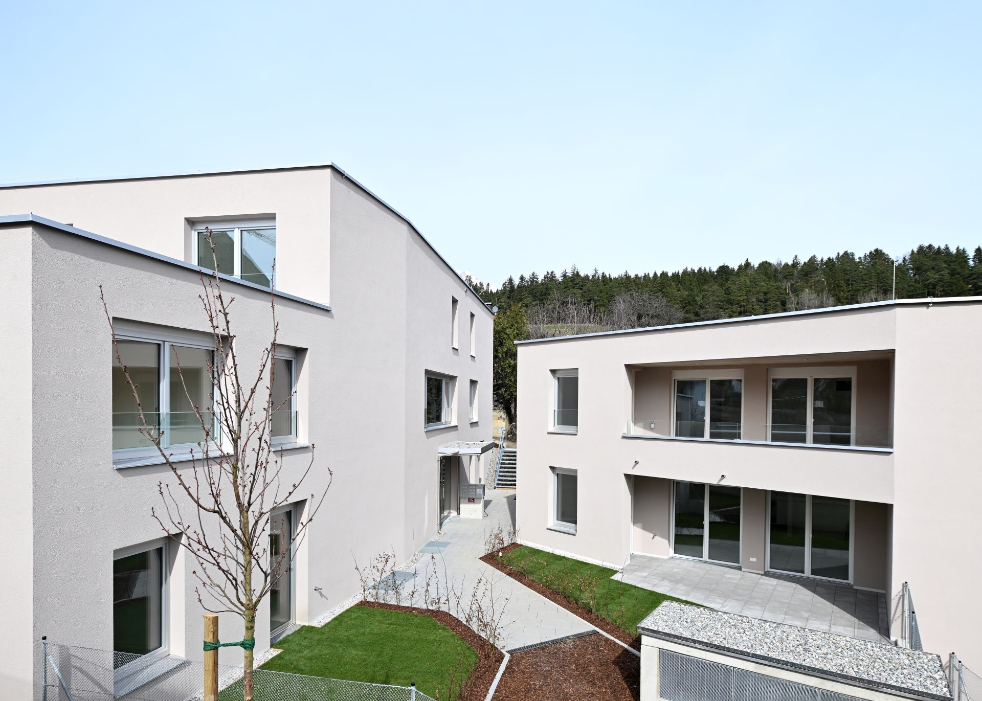 Die beiden Gebäudeteile wurden entsprechend den Gegebenheiten des Grundstücks und in direkten Bezug mit dem Hangverlauf ausgerichtet. Dadurch wurden vielfältige Aufenthaltsqualitäten und ein breites Wohnungsangebot geschaffen.
