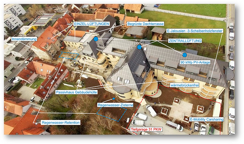 Sanierung des ehemaligen Bezirkspensionistenheim Gleisdorf in eine Passivhaus-Wohnanlage mit 53 Wohnungen mit Wohnbauförderung. Heizkosteneinsparung 85% und komplette Umstellung auf erneuerbare Energie inkl. eigener 80 kWp PV-Anlage.