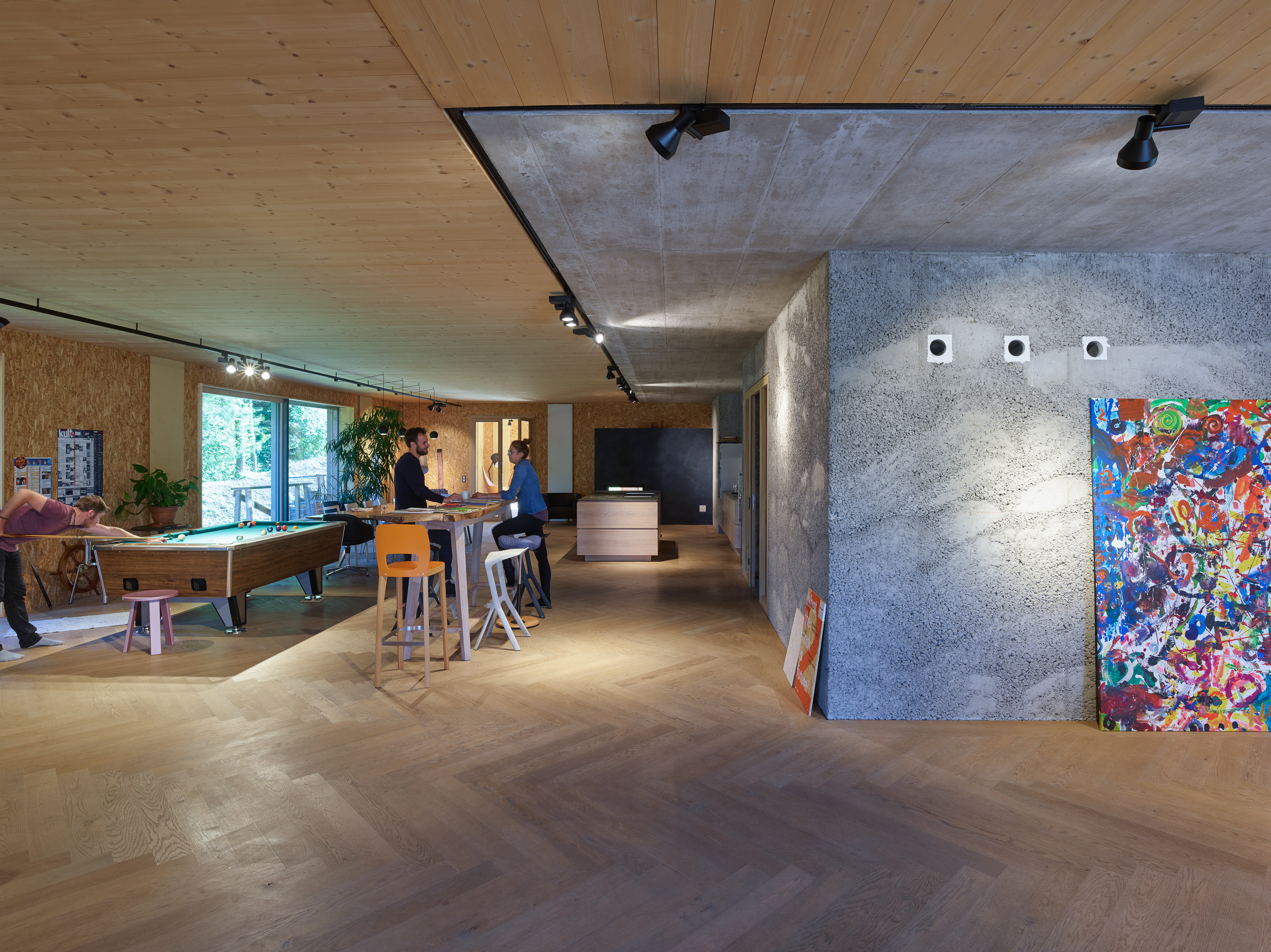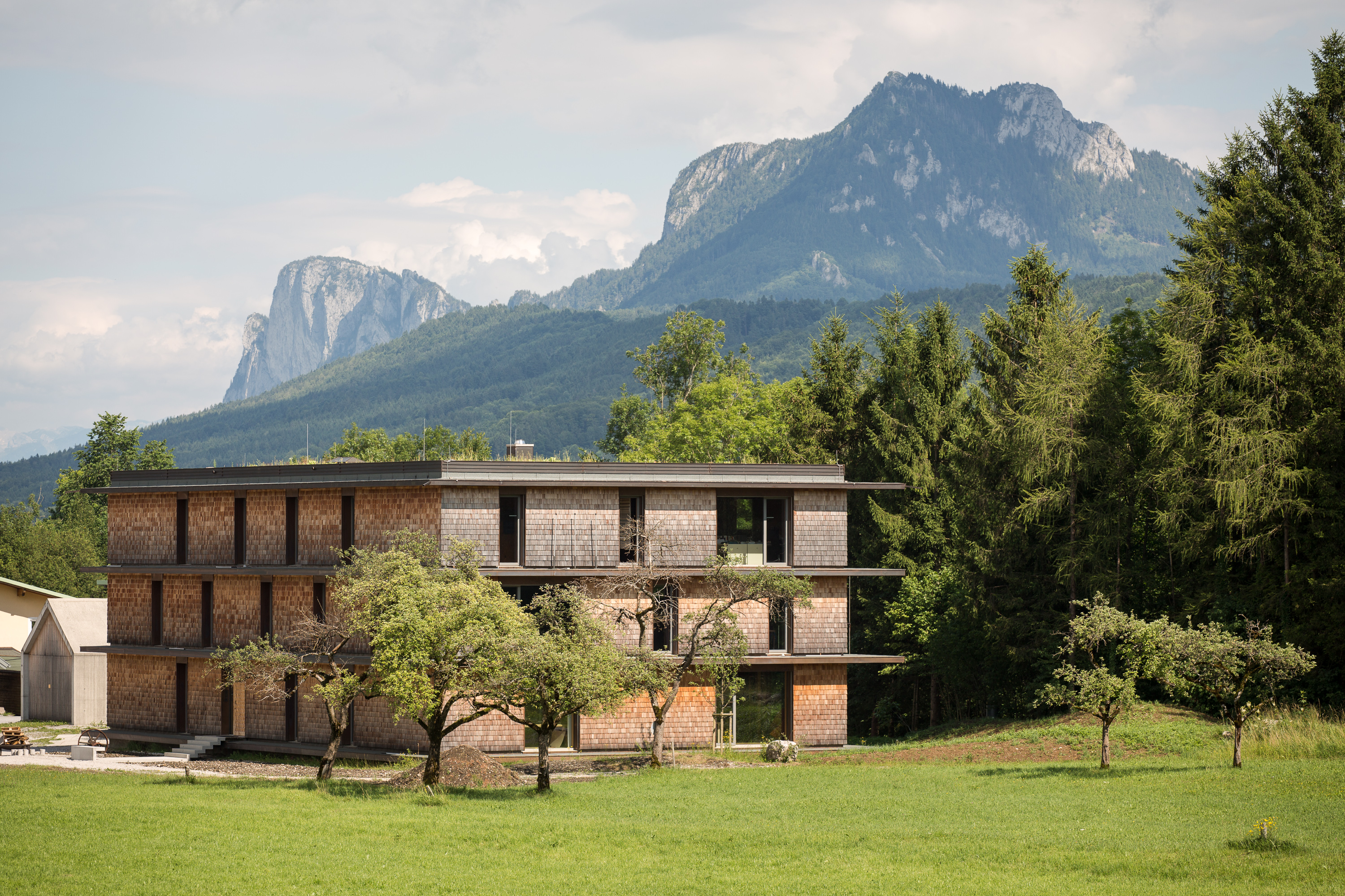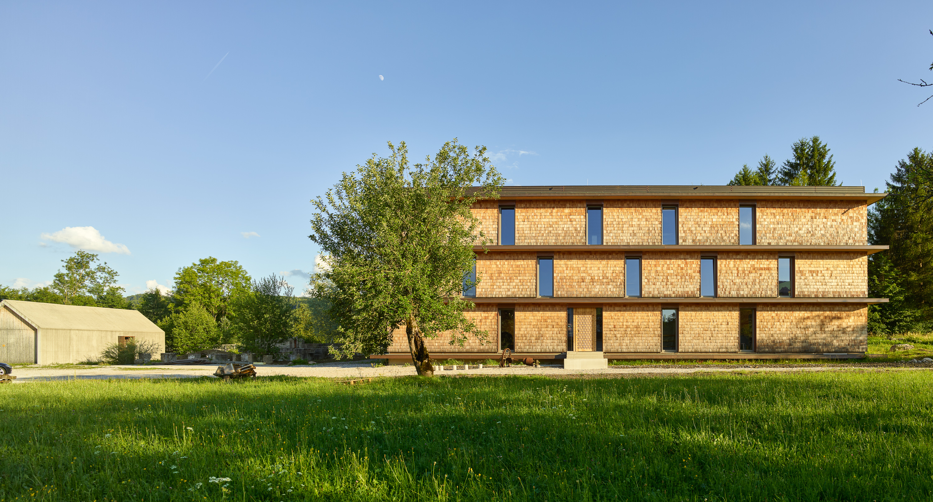 Die eigentliche Gebäudehülle besteht aus mit Zellulose gedämmten Holzriegelwänden, die mit Lärchenholzschindeln verschalt sind. Um den massiven Stampfbetonkern sind die Grundrisse offen und variabel. In Lehmputz integrierte Wandheizungselemente und eine hocheffiziente Lüftungsanlage mit Wärmerückgewinnung garantieren hohen Komfort. Rahmenlose, wärmebrückenfreie Fenster verbinden den Innenraum fließend mit dem Außen.