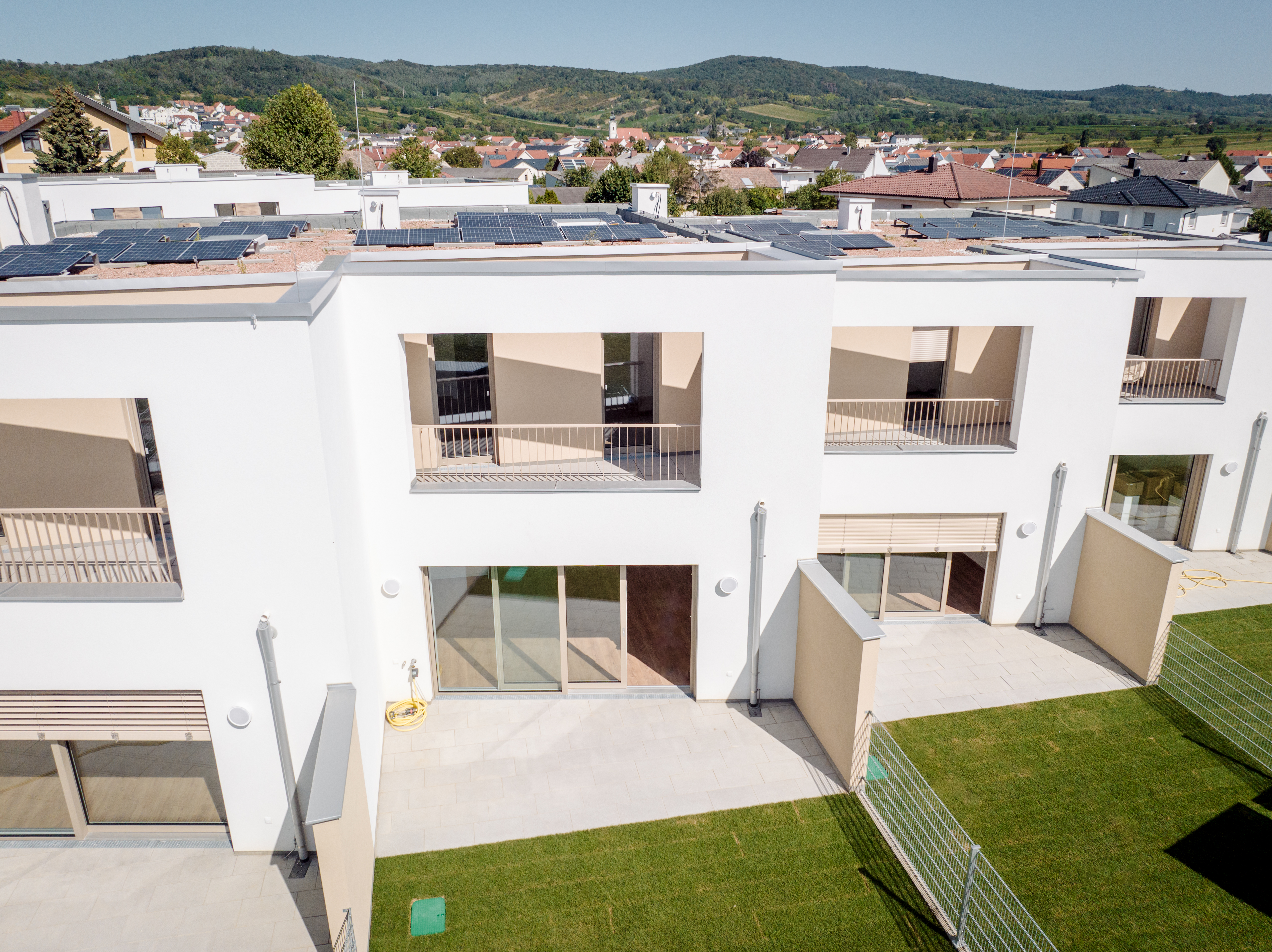 Wohnhausanlage bestehend aus 5 Reihenhausblöcken mit insgesamt 23 Wohneinheiten, Carports, Gartengerätehütten, Müllraum und Hausbetreuerraum.