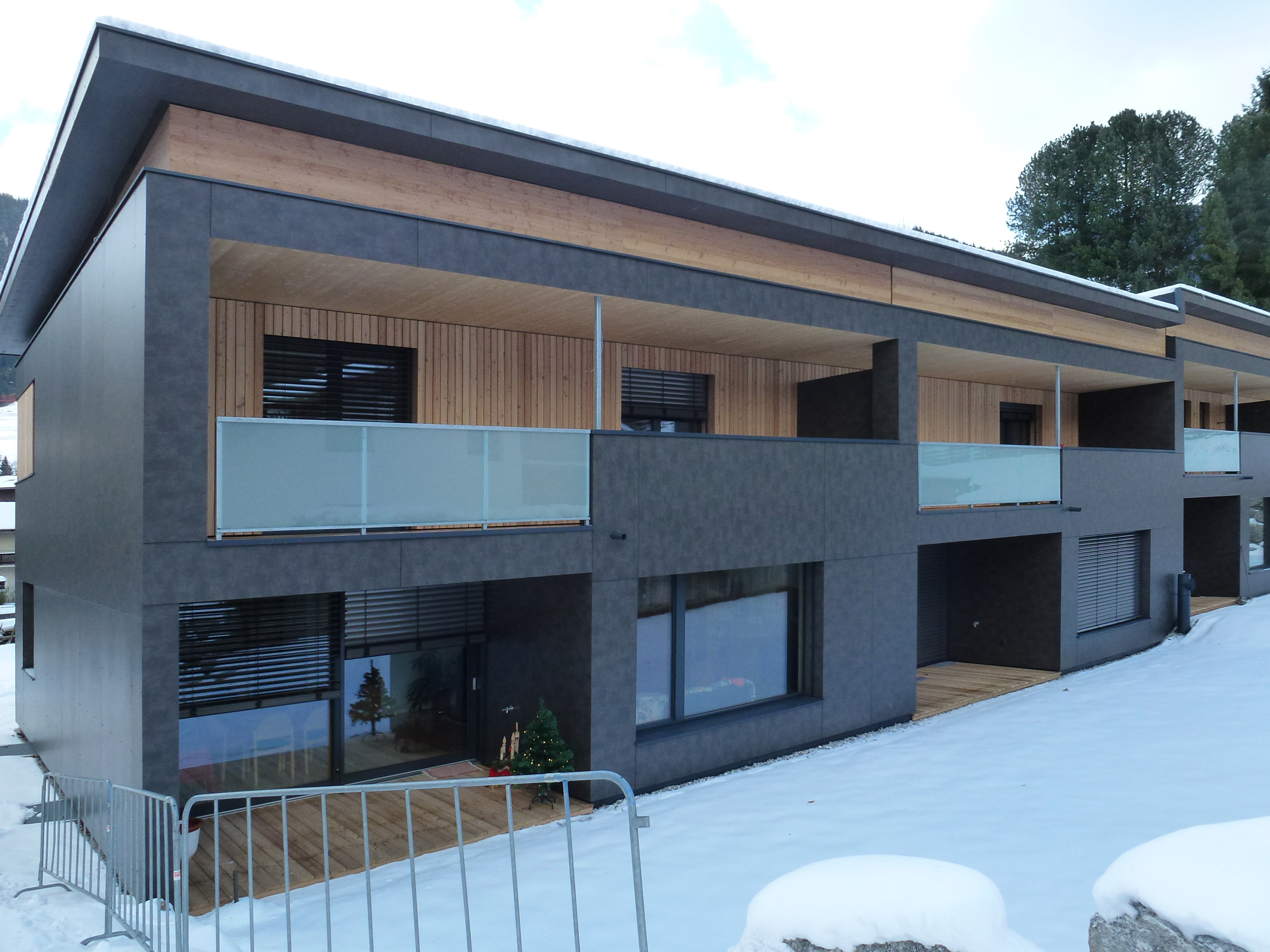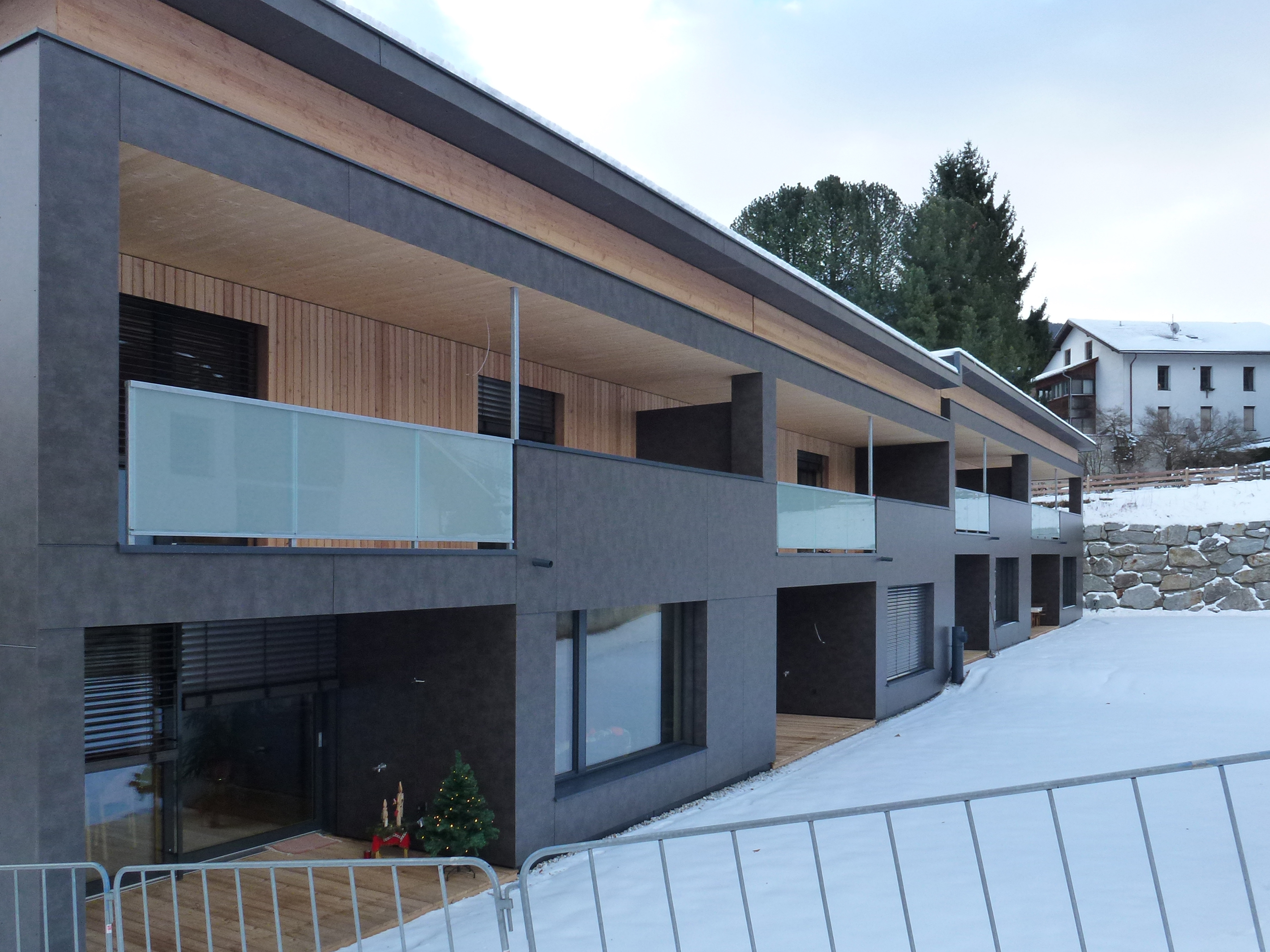 Reihenhäuser in Passivhausstandard, Erdwärme, kontrollierter Wohnraumlüftung und Fußbodenheizung; Fenster: Holz-Alu inkl. Raffstore Sonnenschutz gegen Süden; Fassade: Lärche - Rombusschalung und Funder Max Platten; KG.: wasserdichte Betonwanne