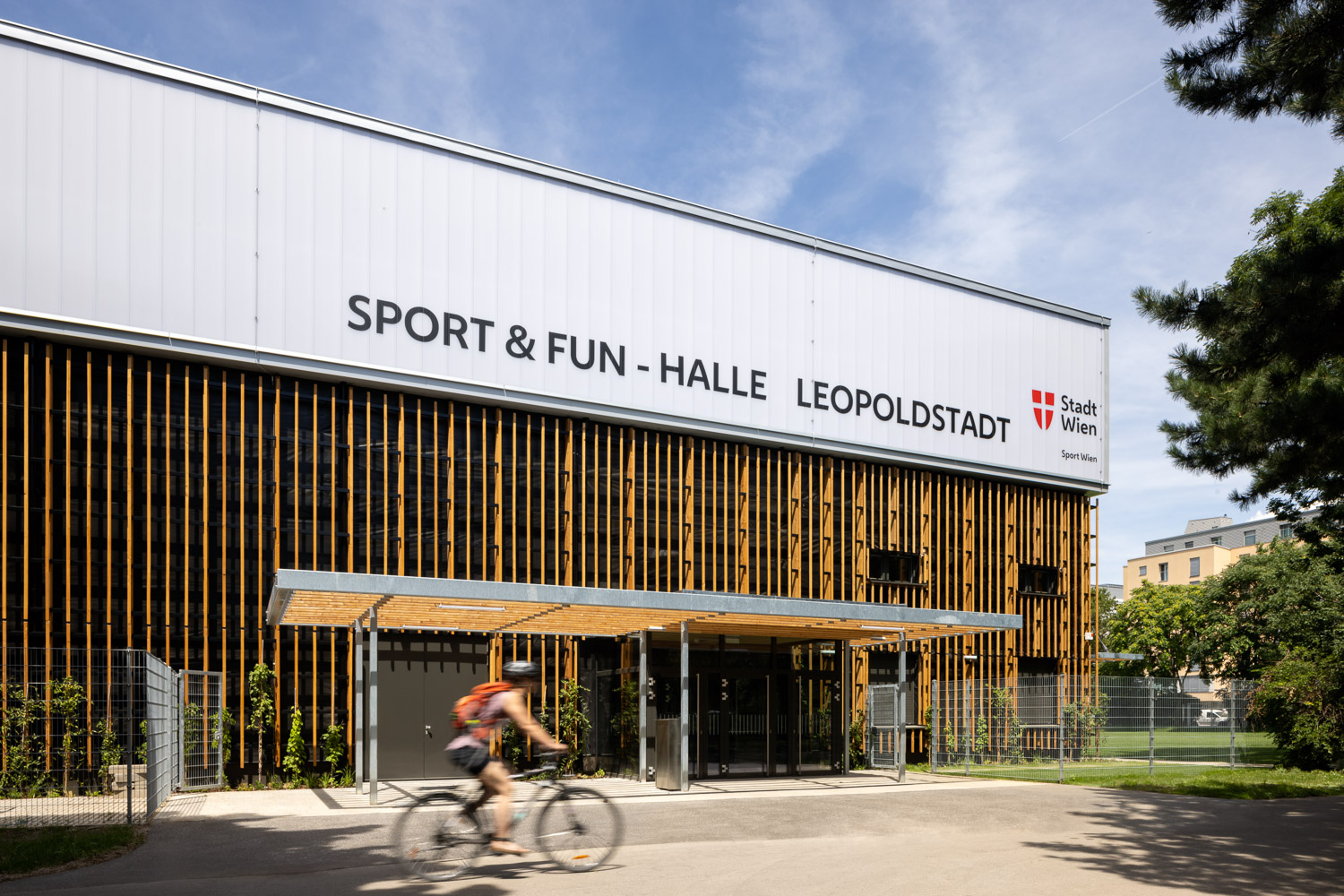 Das Sportangebot im Projektgebiet wird durch die Herstellung einer modernen und energetisch hochwertigen neuen Sport & Fun Halle ausgebaut. In der Fun und Sporthalle Engerthstraße werden die Sportfunktionen der Bestandsjugendanlage und der alten Sport & Fun Halle, welche aufgrund des neuen Fernbusterminals abgerissen wurde, kombiniert und erweitert. Das ca.13m hohe Gebäude der Sport & Fun Halle ist als höchst ökologischer Bau konzipiert. Eingebettet in ein grünes Umfeld mit wertvollem Baumbestand, fügt sich die Halle mit der ca. 7m hohen, flächig bewachsenen Grünfassade selbstverständlich in die Umgebung ein. Es handelt sich um einen Holzbau im Sporthallenbereich, die Nebenräume sind als mineralischer Bau in Stahlbeton ausgeführt.