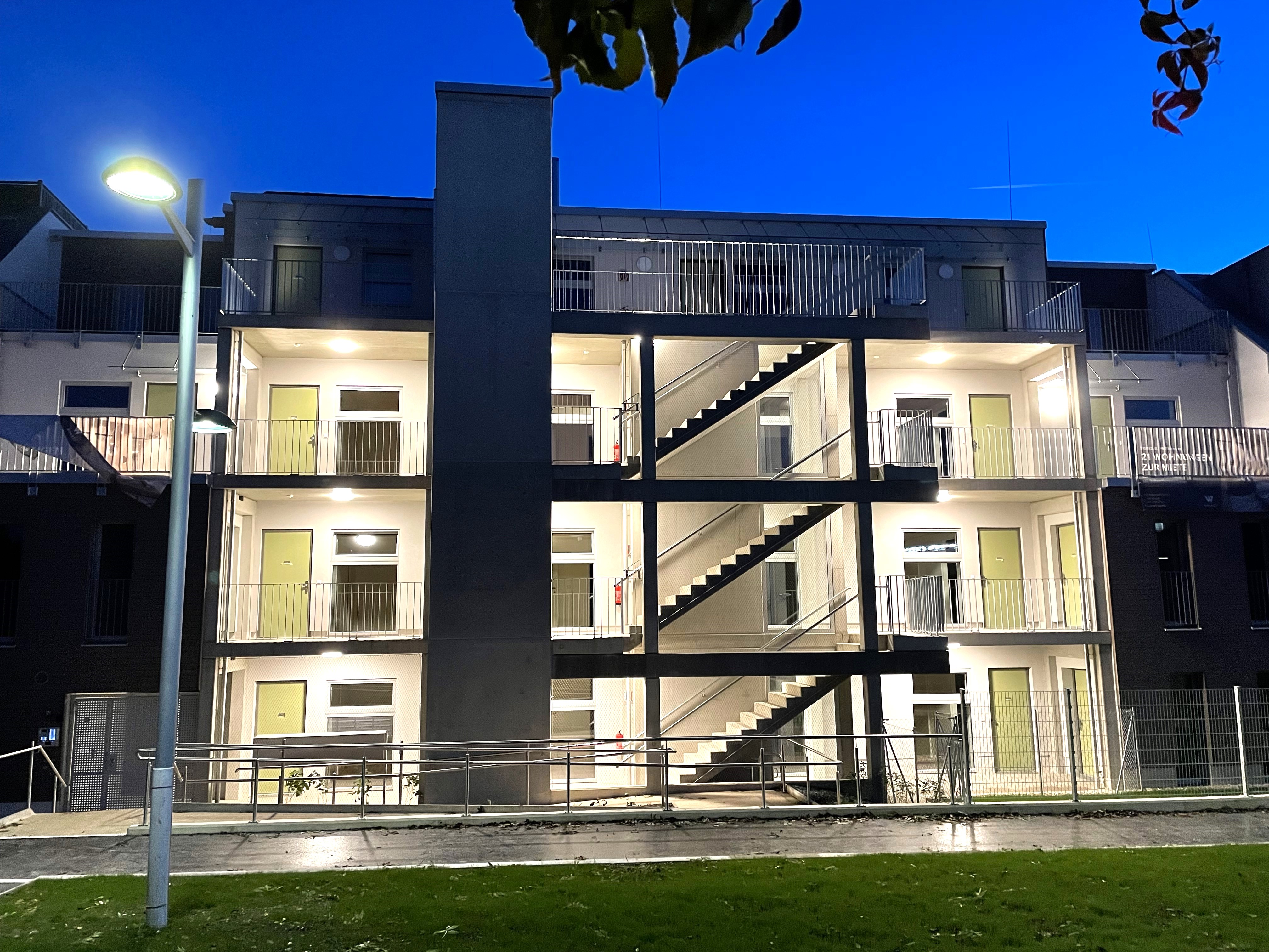 Die Beheizung der Wohnhausanlage erfolgt mittels einer Luft-Wasser-Wärmepumpe in Kombination mit einer PV-Anlage, wodurch auch im Sommer über eine Stützkühlung eine angenehme Raumtemperatur geschaffen werden kann.