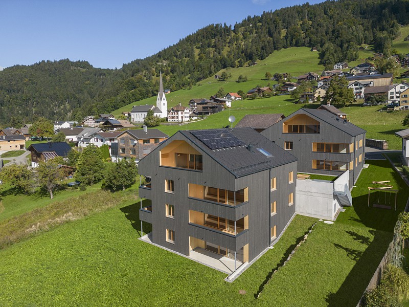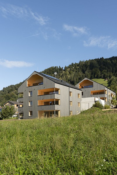 Die Errichtung der kleinen Wohnanlage LATERNS V 207 entspringt dem Wunsch der Gemeinde Laterns, wobei auf kleinteilige Gebäude, Satteldachausführungen und Holzfassaden geachtet werden sollte.