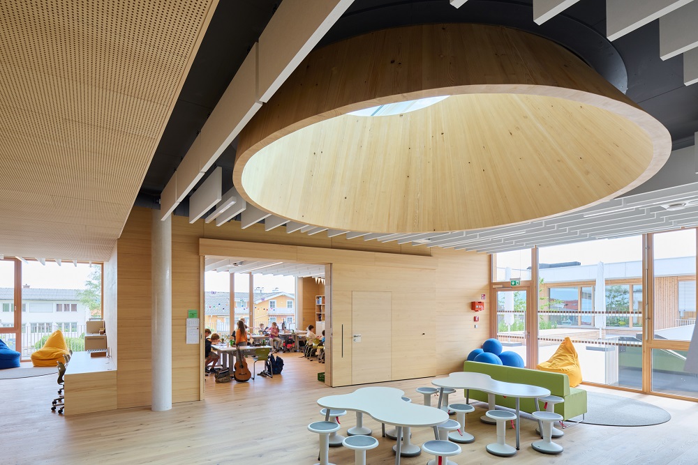 Die neue Volkschule punktet mit einer großzügigen Lernlandschaft mit Lerninseln und Terrassen, fließenden Raumübergängen, die innen und außen verbinden, Freiflächen für Schulkinder mit Obstbäumen und einem Naschgarten sowie einem ausreichenden Platzangebot für die Nachmittagsbetreuung. Eine hochwertige und nachhaltige Ausstattung mit viel Holz (Böden, Fenster, Fassade, Wandverkleidungen) und Akustikdecken sorgen für ein angenehmes Lernklima.