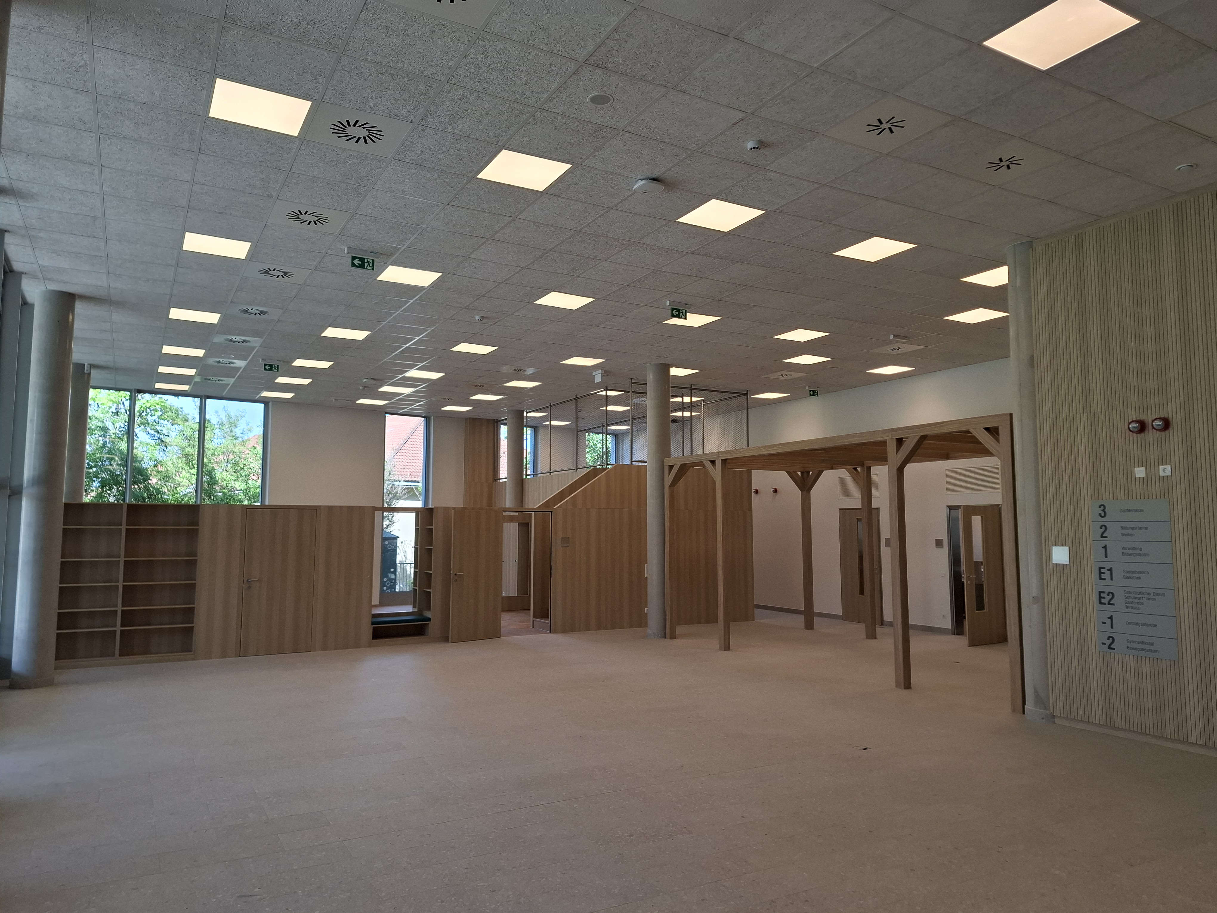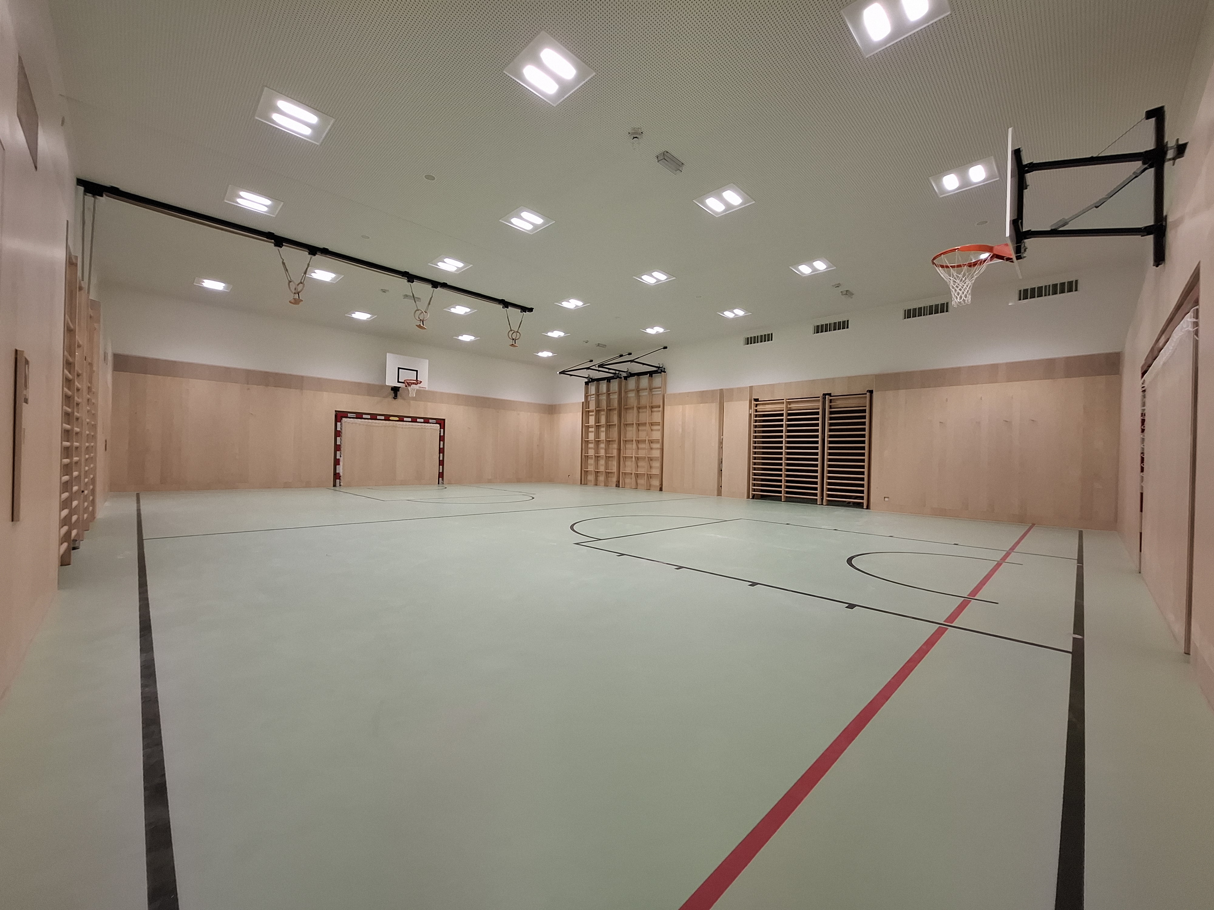 Im Erdgeschoss ist die multifunktionale Aula das zentrale Element. Der Eingangsbereich mit Sitzstufen, der Speisesaal und die Bibliothek sind offen und multifunktional gestaltet. Eine große, überdachte Eingangsloggia bietet einen wettergeschützten Aufenthaltsbereich im Freien. Die transparente Fassade ermöglicht eine starke Verbindung zum Außenbereich. Der Turnsaal und der Bewegungsraum wurden im Untergeschoss direkt nebeneinander umgesetzt.