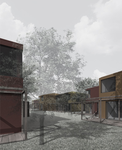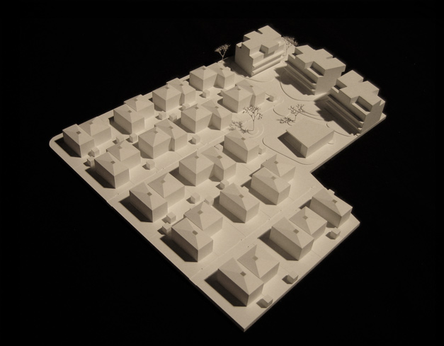 Die Gartensiedlungshäuser sind nicht unterkellerte Doppelhäuser oder Einzelhäuser, die als eine Wohneinheit ausgebildet sind. Die Häuser werden über einen von Pergolen gesäumten Zugang von den internen Erschließungswegen der Gesamtanlage aus erreicht. Im Erdgeschoß befinden sich ein Vorraum mit Garderobe, ein WC, ein Technikraum für die Wärmepumpe und das Lüftungsgerät, sowie die Küche und der Abstellraum mit anschließendem Wohnraum mit vorgelagerter, von Pergolen überdachter Terrasse. Eine einläufige Treppe, über ein Oberlicht mit natürlichem Licht versorgt, führt in das Obergeschoß. Hier befinden sich ein Bad sowie drei Wohnräume.Der Einlagerungsraum wird als eigenständiges Gebäude auf dem Grundstück ausgebildet.